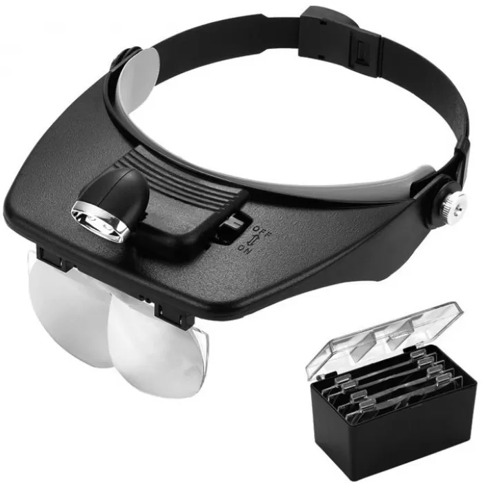 Лупа налобная со сменными пластиковыми стеклами-насадками и удобным фиксатором-обручем на голове. Светодиодная подсветка (2 супер-ярких светодиода) позволяет работать в условиях недостаточной освещенности.