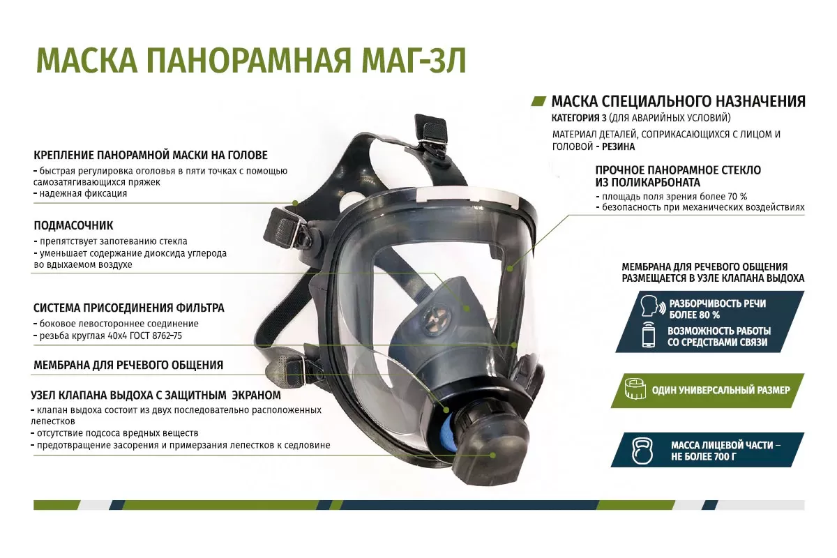 - Панорамная маска МАГ-3Л категория 3 одного универсального размера с одним боковым резьбовым узлом для присоединения фильтров, расположенным с левой стороны.