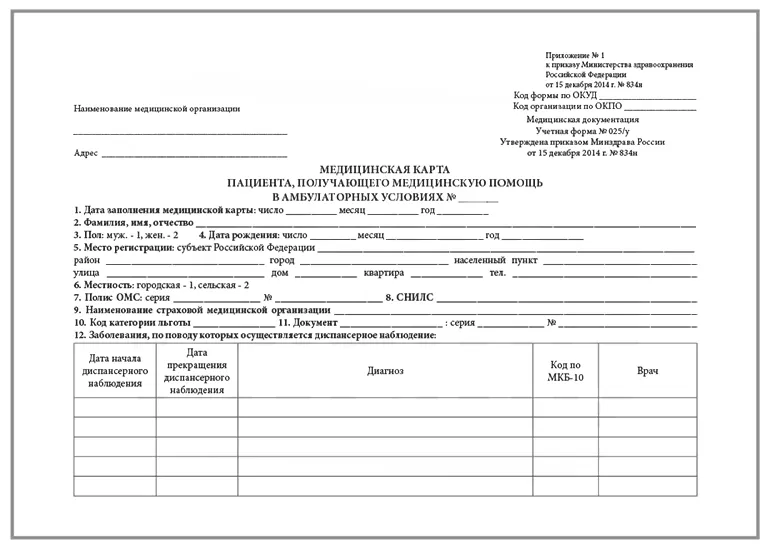 Бланк карты амбулаторного больного является Приложением №1 к приказу Минздрава №834н, вышедшему в 2014 году, и в таком виде используется в настоящее время. Документ содержит 14 страниц и включает в себя 35 пунктов для внесения данных. Заполняется бланк медицинской амбулаторной карты также в соответствии с вышеозначенным приказом. Регламентирует порядок заполнения Приложение №2.