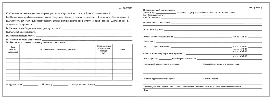 Форма медицинской амбулаторной карты 025 у должна содержать все паспортные данные о пациенте, включая семейное положение. Это часть базовых сведений, являющихся актуальными в долгосрочной перспективе (т.е., неизменными довольно продолжительное время или на протяжении всей жизни). К таковым также относятся: группа крови, резус-фактор сведения полиса ОМС, наличие льгот и уже имеющиеся у пациента хронические заболевания, аллергические реакции, инвалидность.