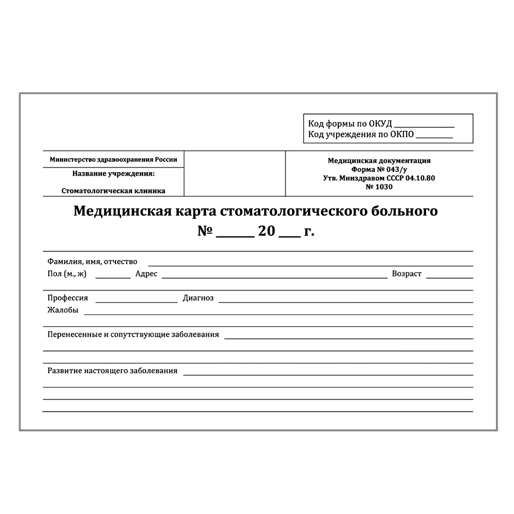 - Действующая на сегодняшний день форма 043 у была разработана, утверждена и введена в обращение 4 октября 1980 года. Орган утвердивший документ – Минздрав СССР. Бланк используется амбулаторными стоматологическими учреждениями как основной учетный документ для фиксации данных о пациентах и ходе лечения.