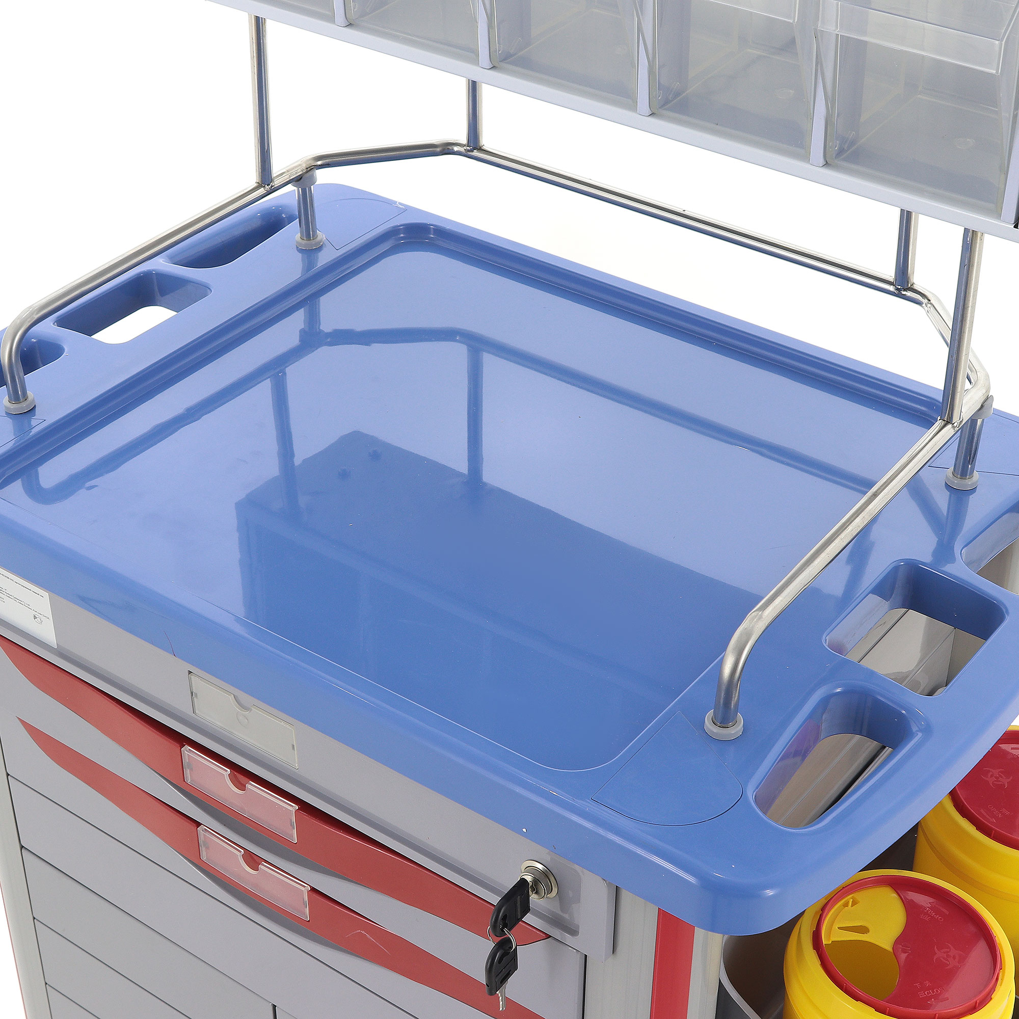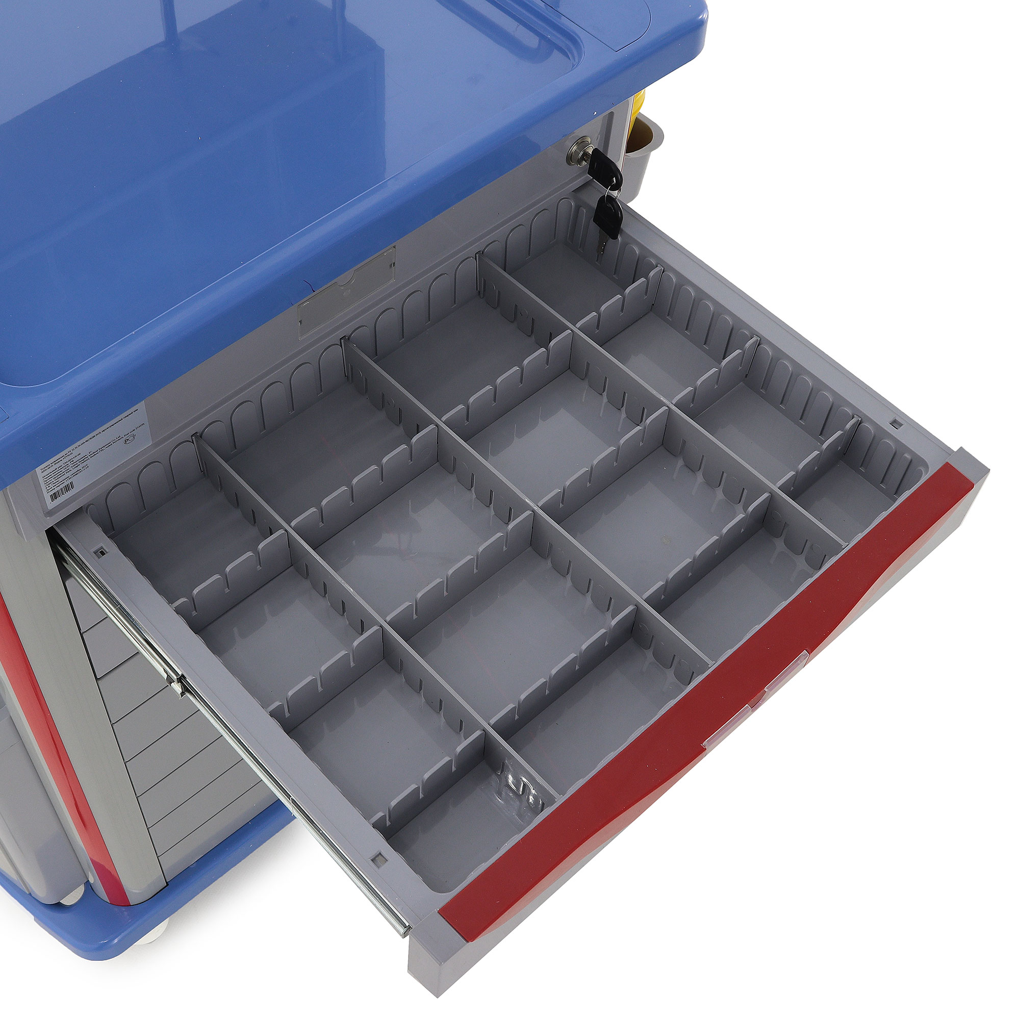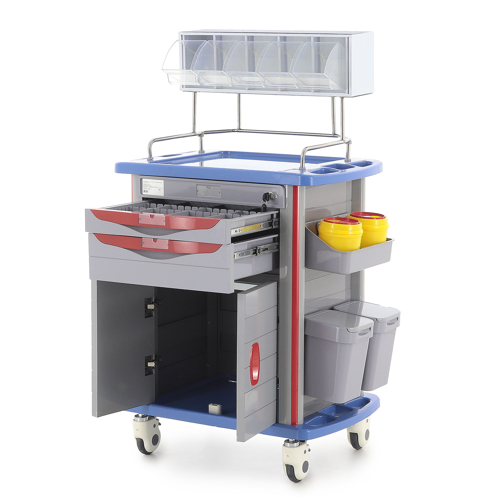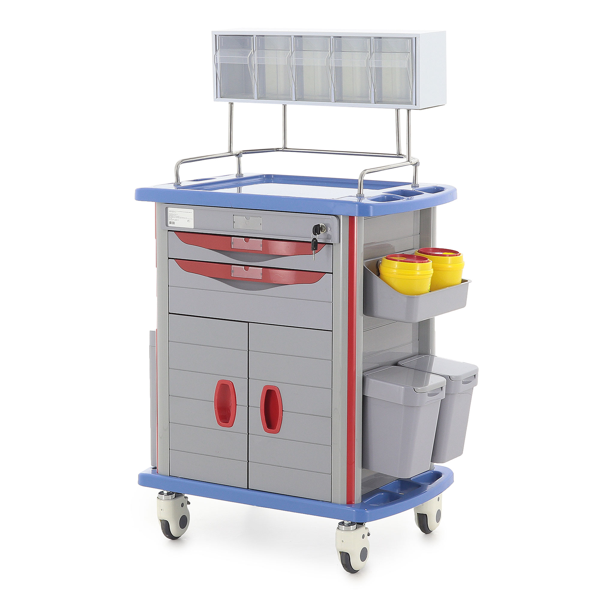 - Функциональность: Два ящика с перегородками, анестезиологическая стойка с пятью контейнерами и шесть навесных ёмкостей обеспечивают организованное хранение.