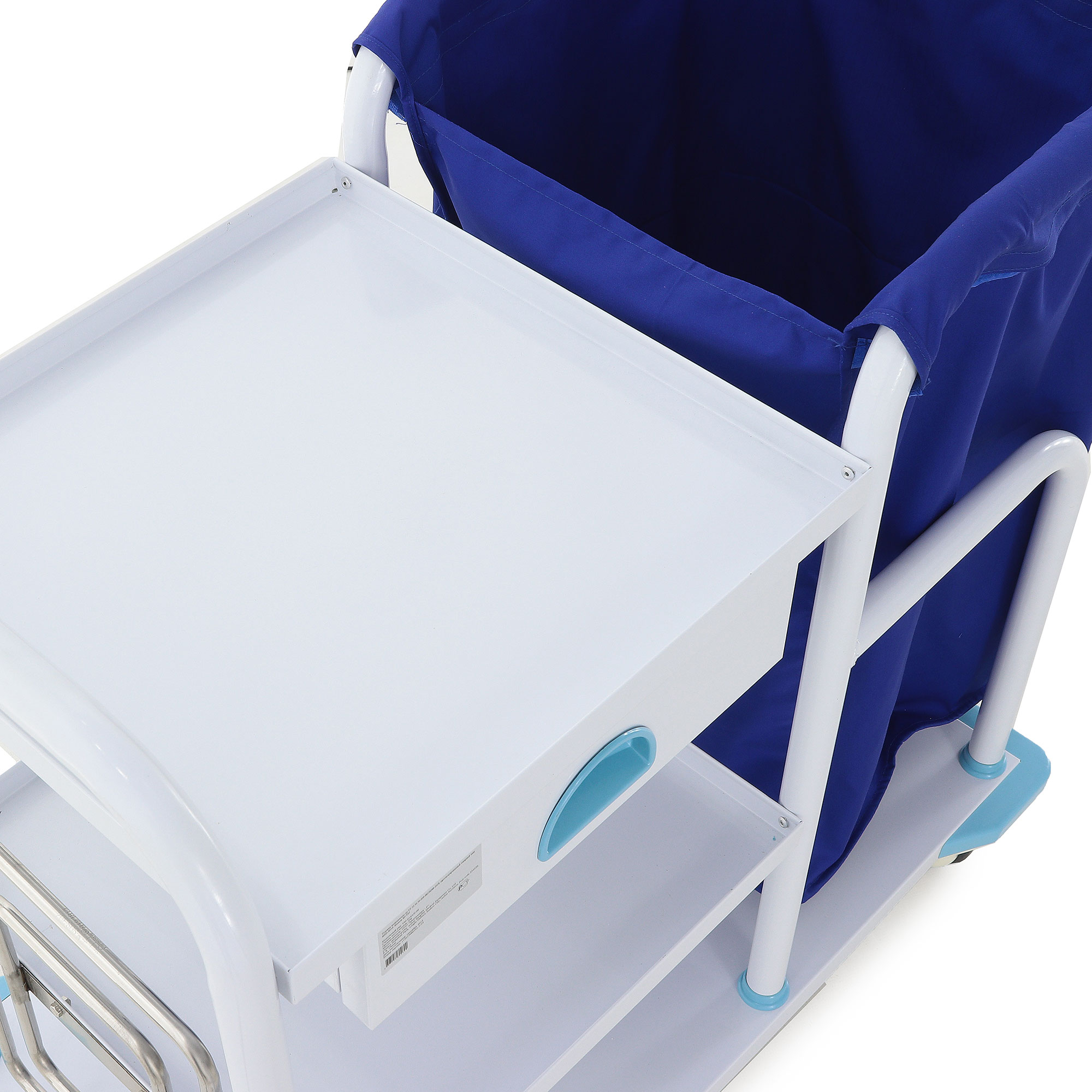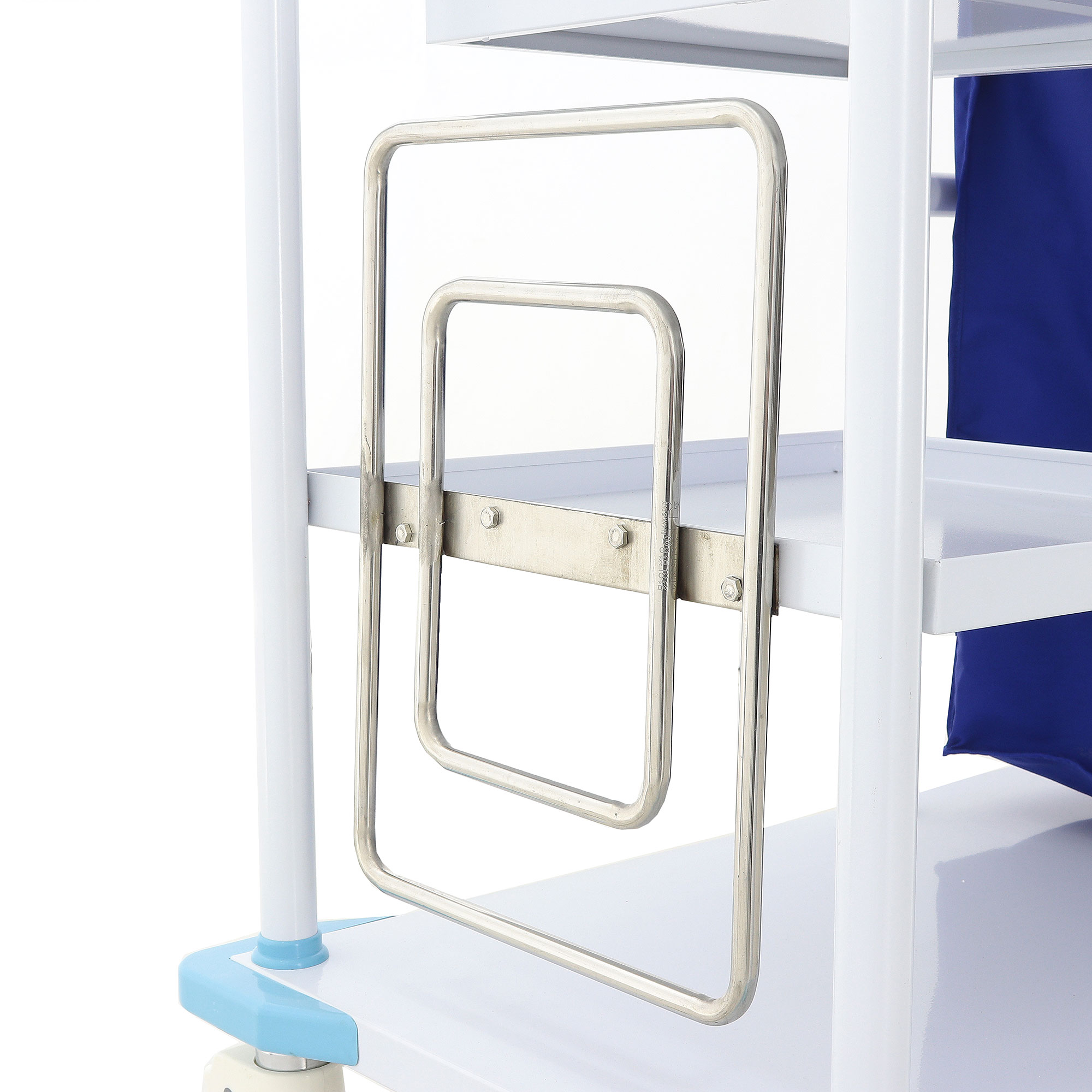 Медицинская тележка МСТ05 TM-019AH-00 разработана для перевозки белья, одежды и выполнения терапевтических задач в медицинских учреждениях. Эта универсальная модель сочетает компактность, прочность и функциональность, обеспечивая удобство в эксплуатации. Тележка оснащена тремя ярусами (столешница, полка и основание), одним выдвижным ящиком и вместительным тканевым мешком объёмом 120 литров для транспортировки текстильных изделий.