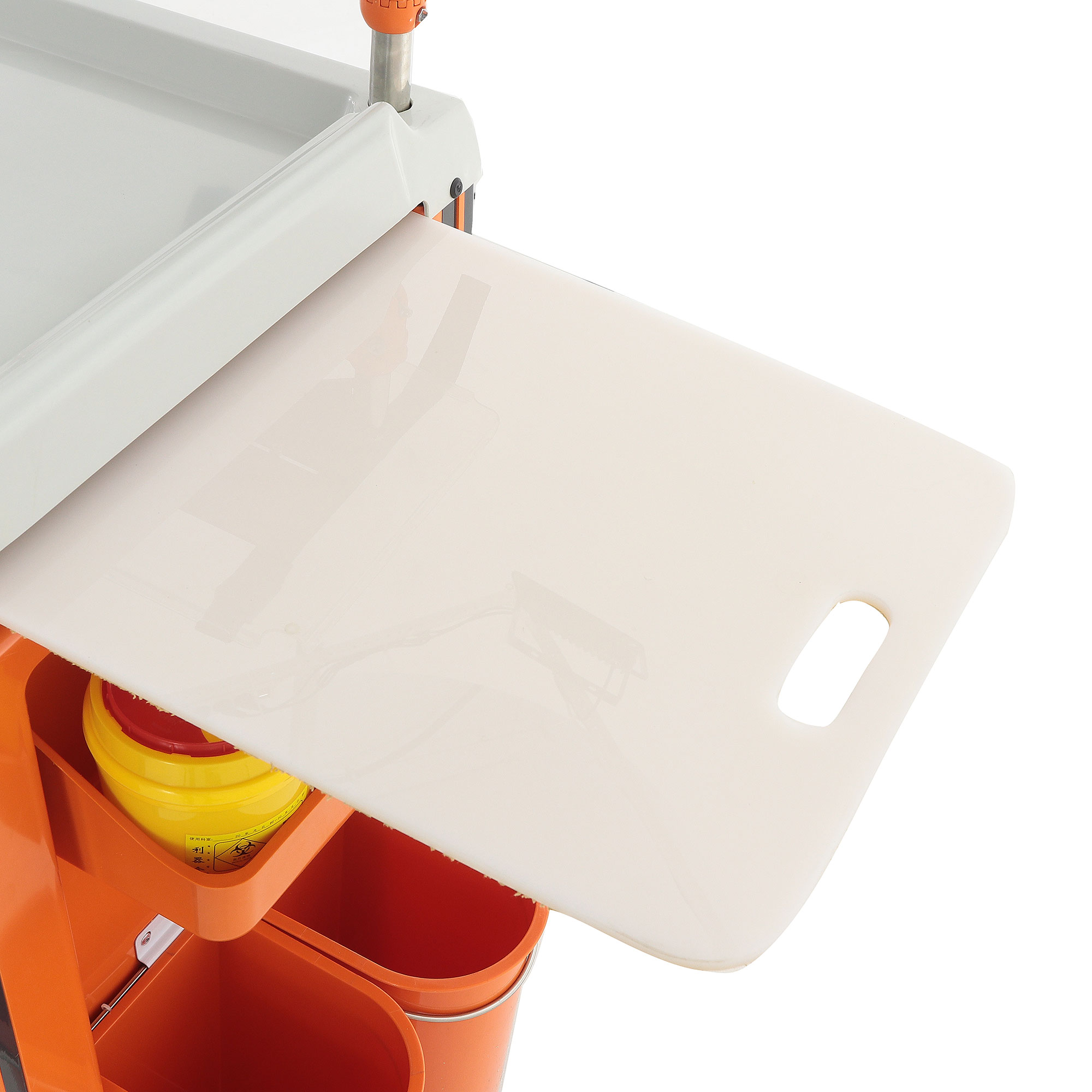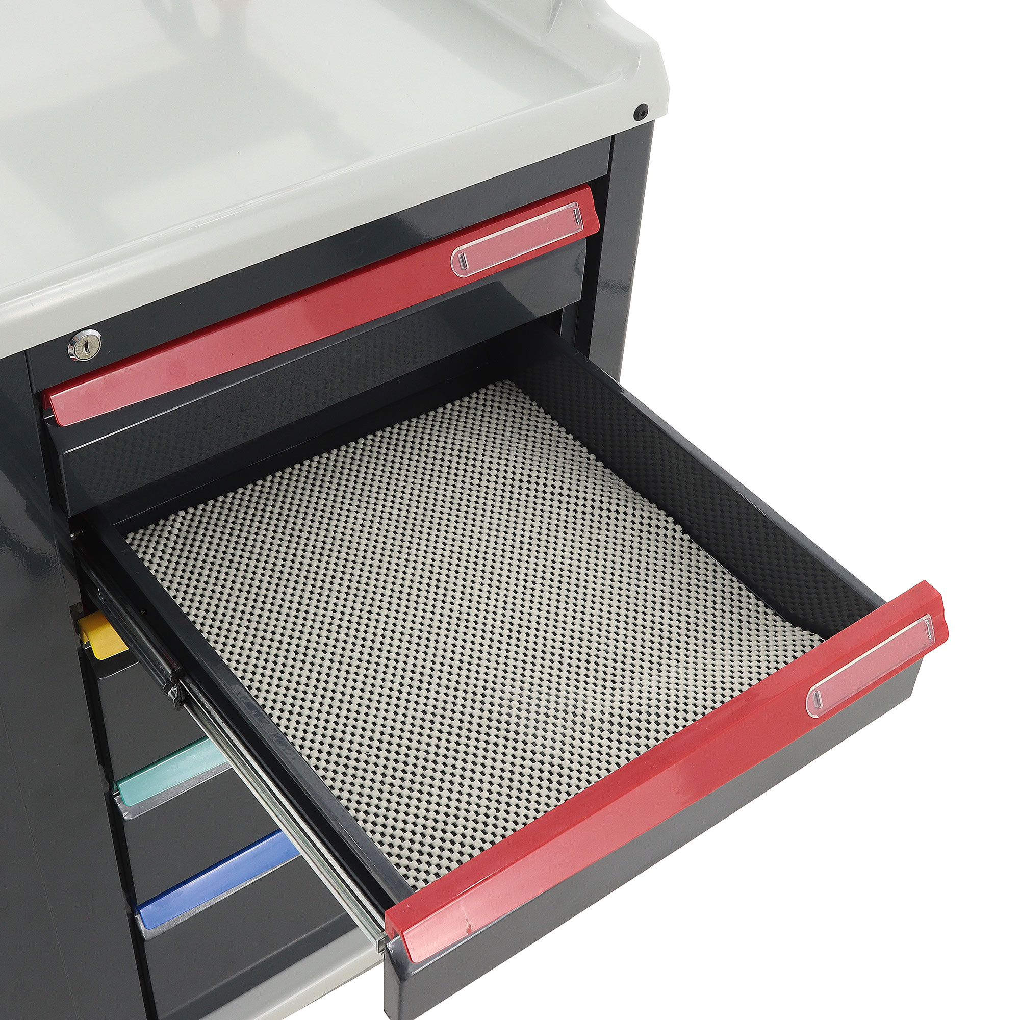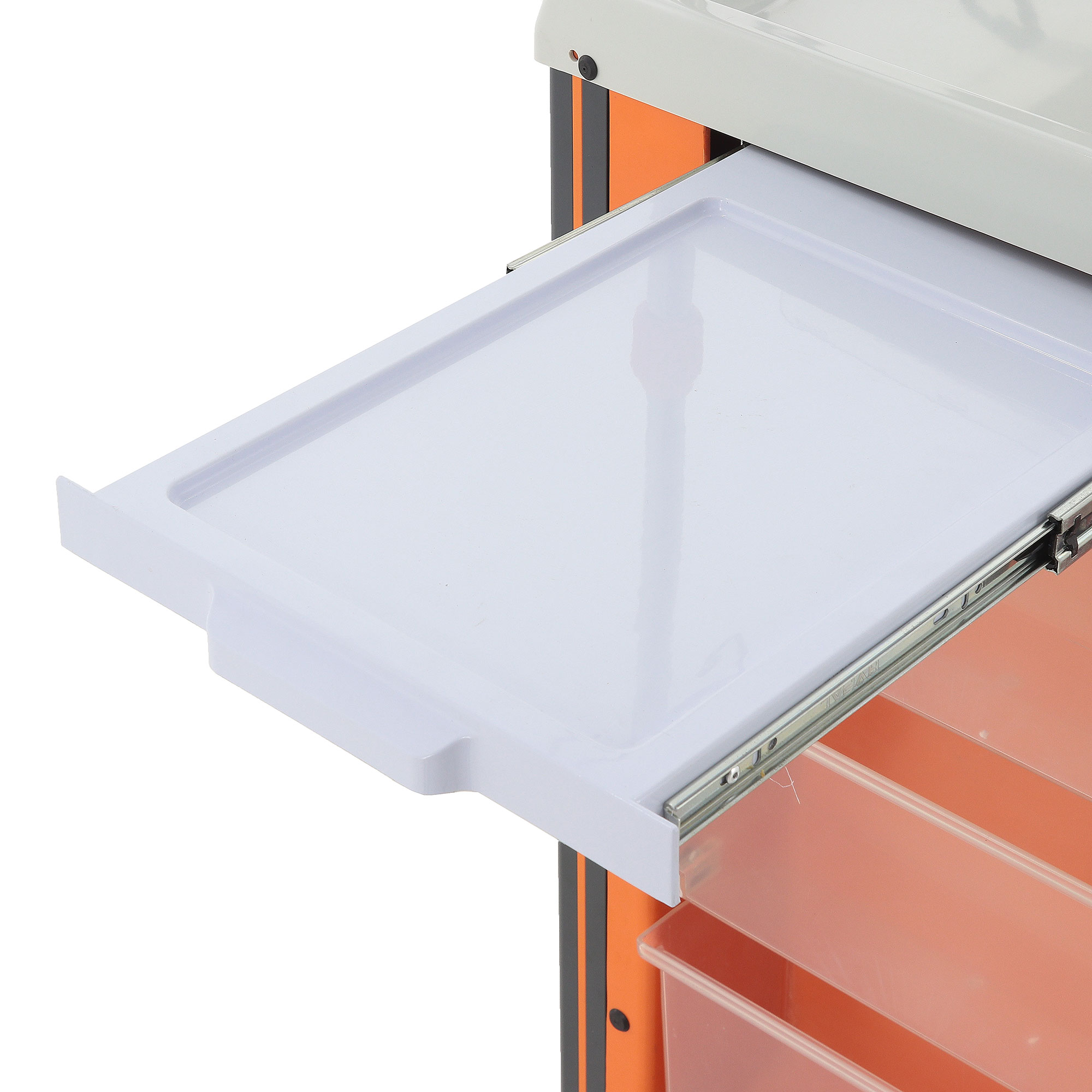 Медицинская тележка РЕТ02 TM-006AH-00 разработана для экстренной медицинской помощи, включая реанимационные мероприятия и транспортировку оборудования в условиях интенсивной терапии. Эта многофункциональная модель оснащена пятью выдвижными ящиками с доводчиками, поворотным столиком для дефибриллятора, инфузионной стойкой с двумя крючками, доской для сердечно-лёгочной реанимации и восемью навесными ёмкостями для инструментов и медикаментов.
