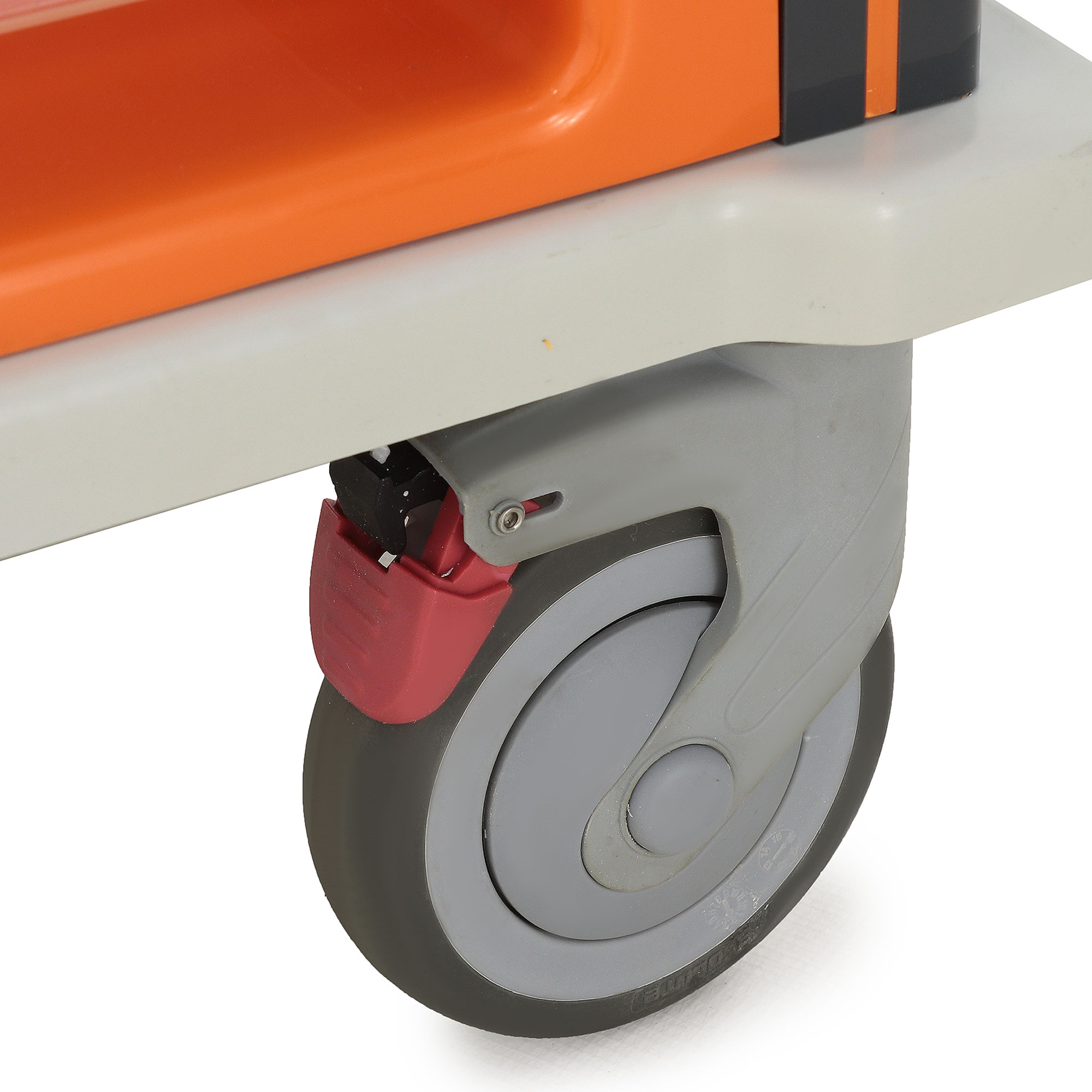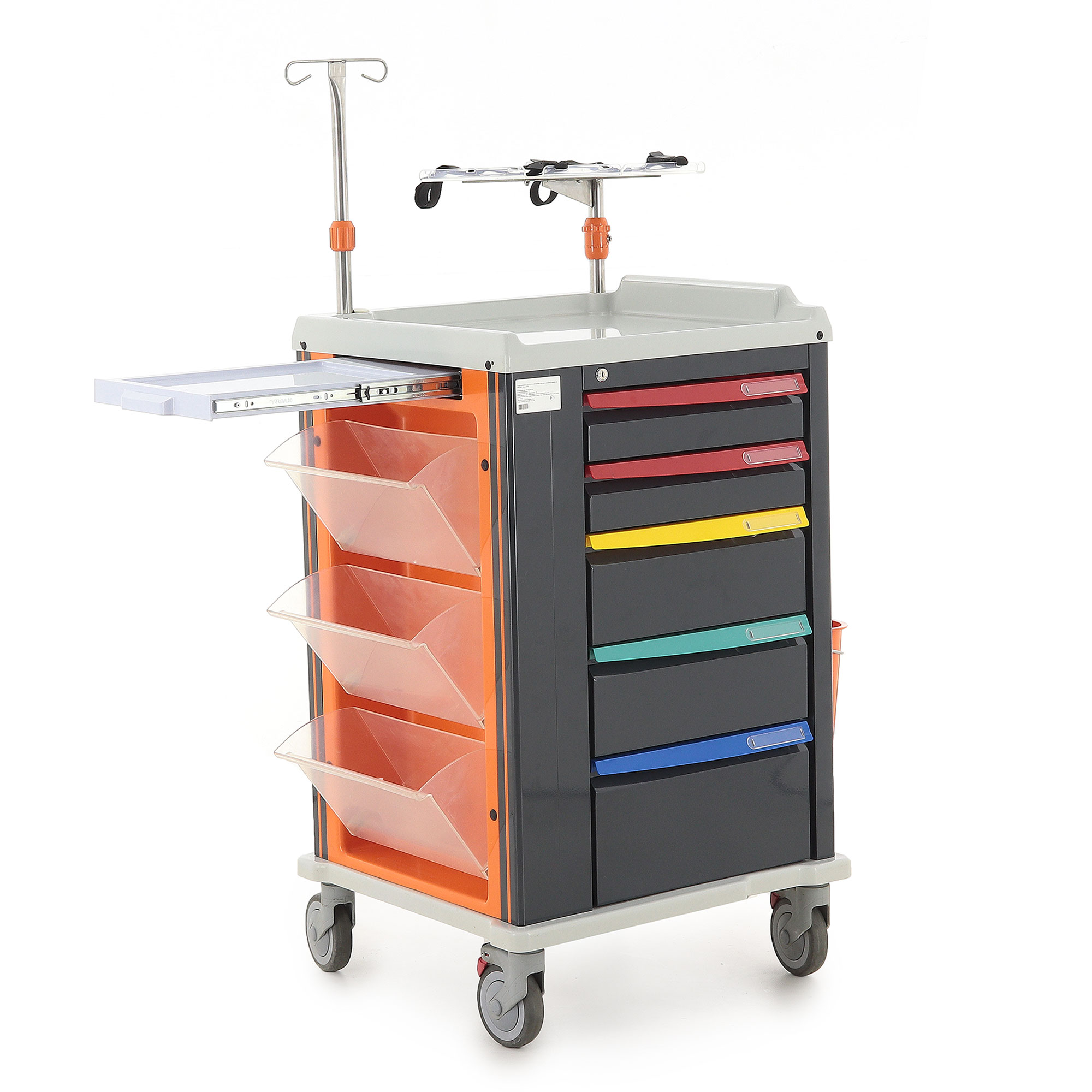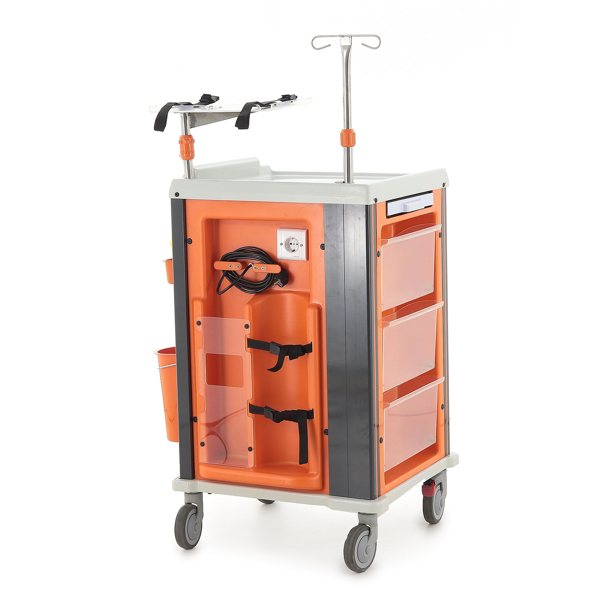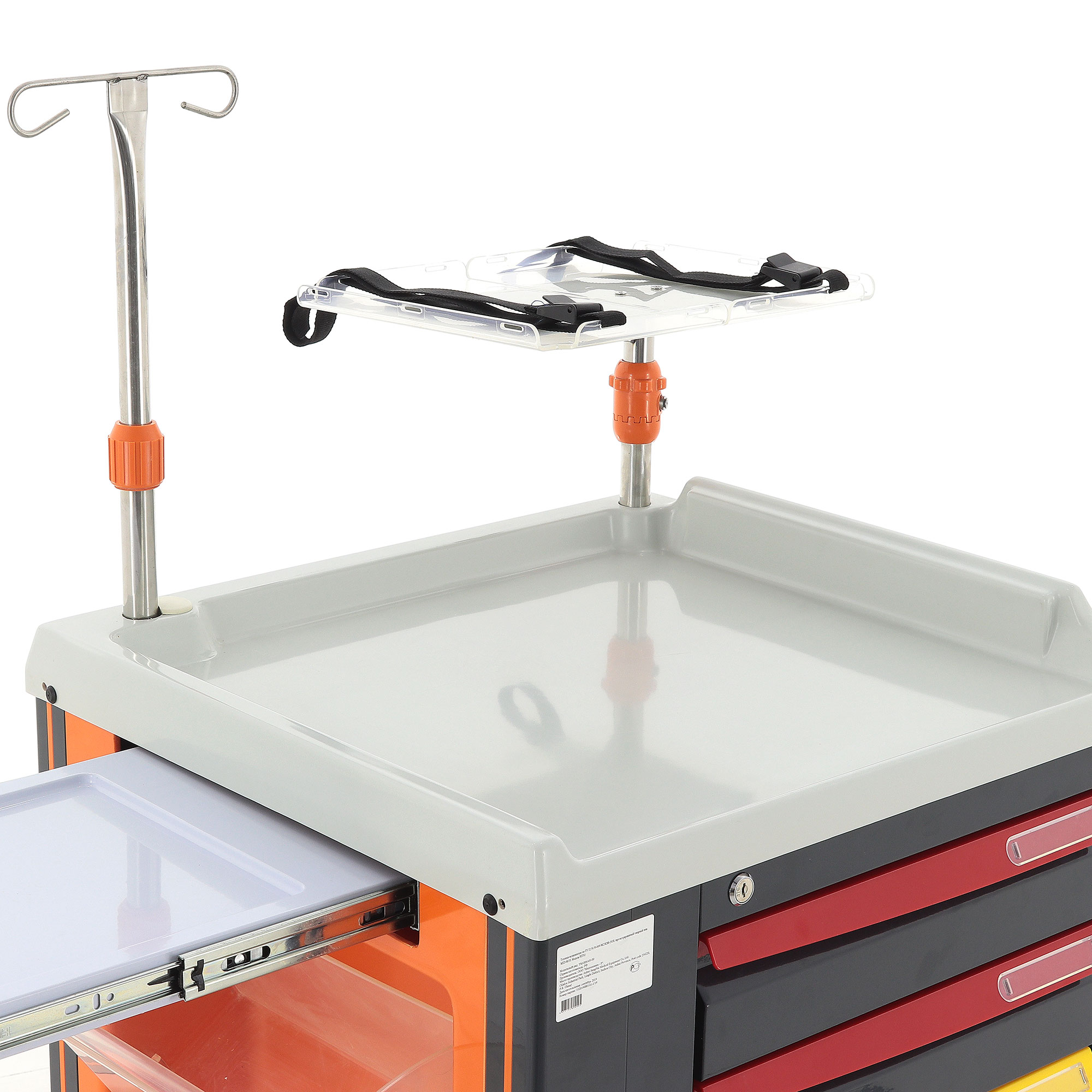 - Многофункциональность: Пять ящиков с перегородками, поворотный столик, инфузионная стойка, доска для реанимации и держатель баллона для комплексной поддержки экстренной помощи.