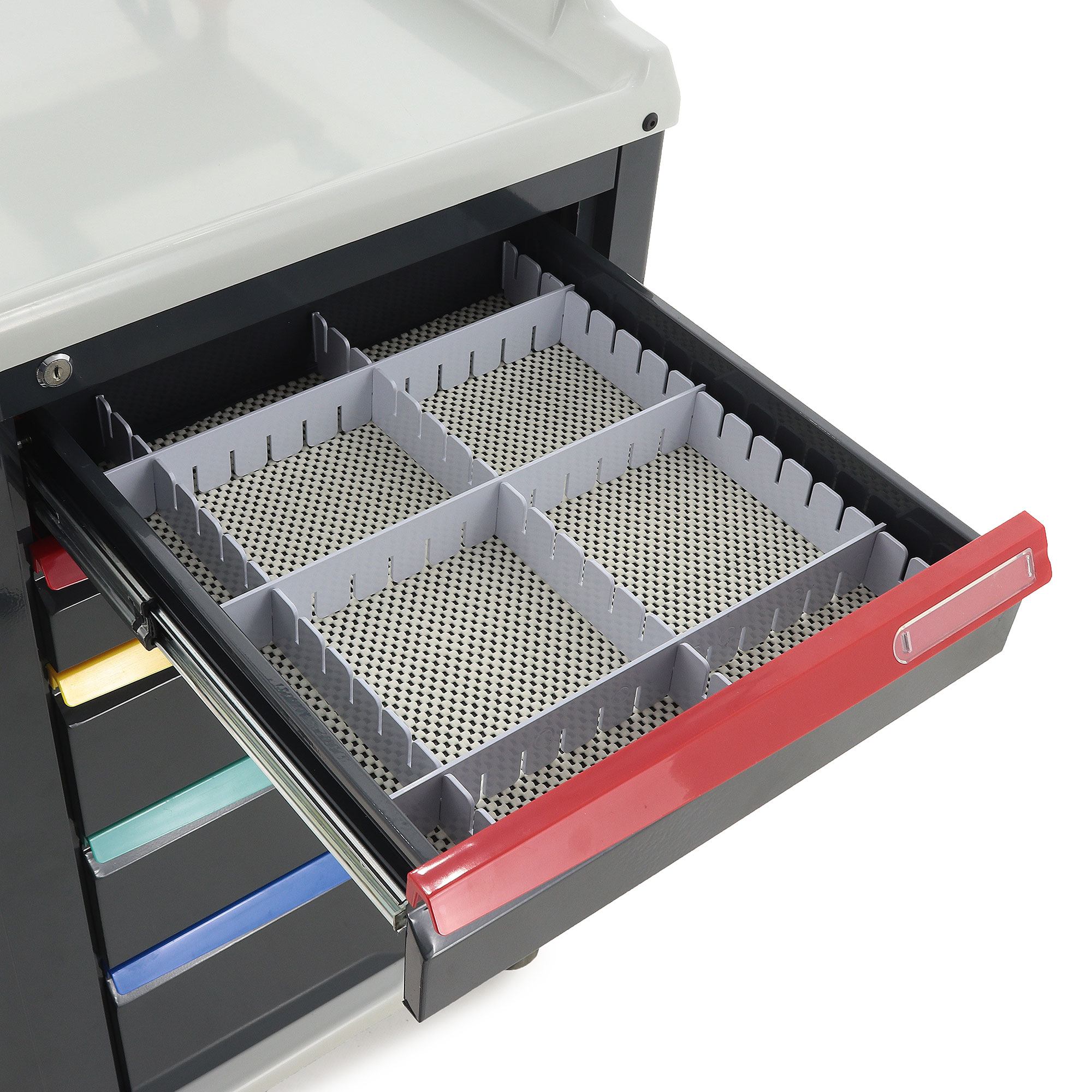 - Внутренние размеры: 375x350x65 мм, фасад: 405x95 мм, ручка: красная, перегородки: 6 шт., коврик 1,5 мм
