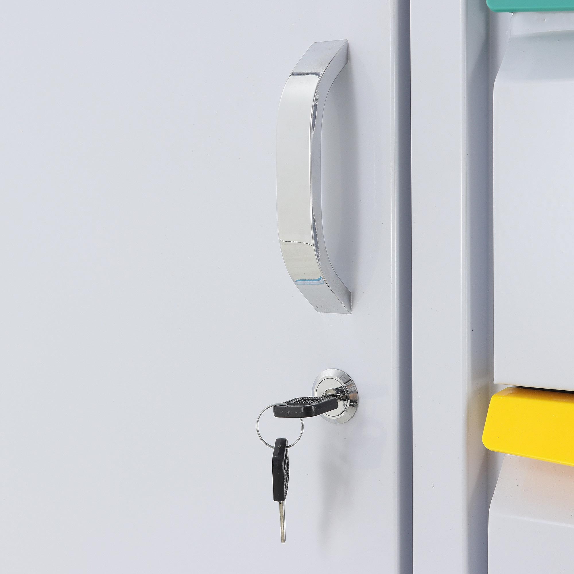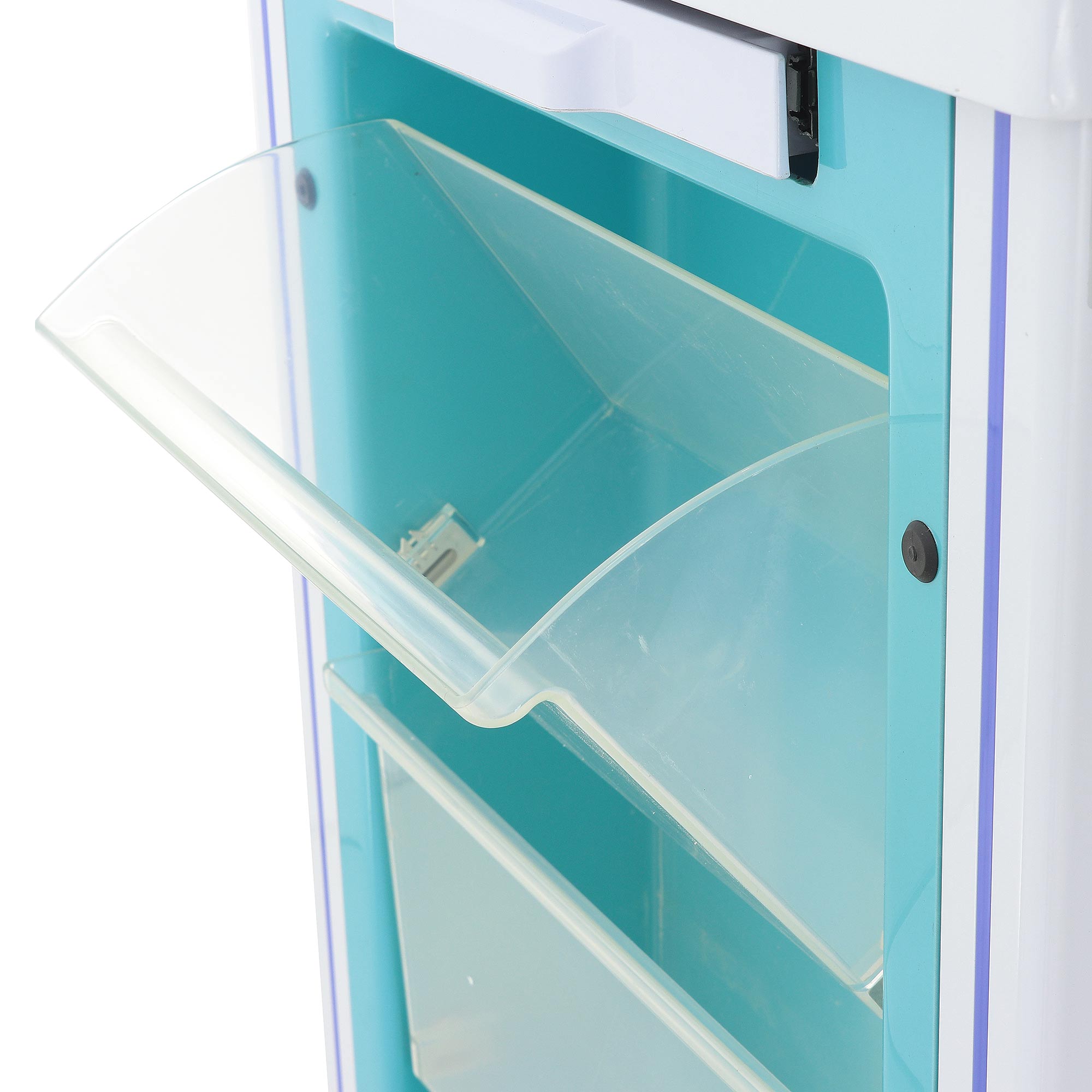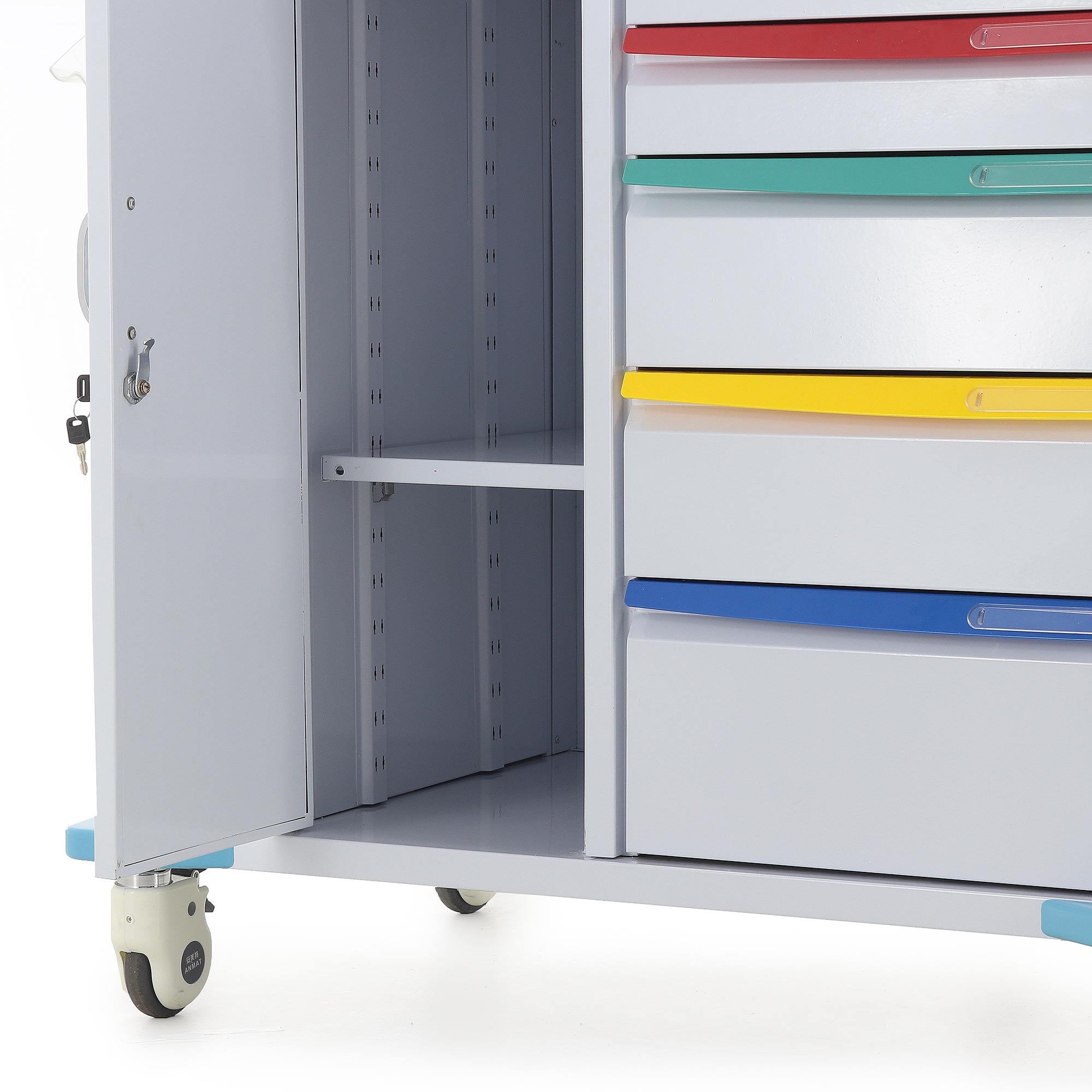- Использования в процедурных кабинетах благодаря ящикам, отделению с дверкой и навесным ёмкостям.