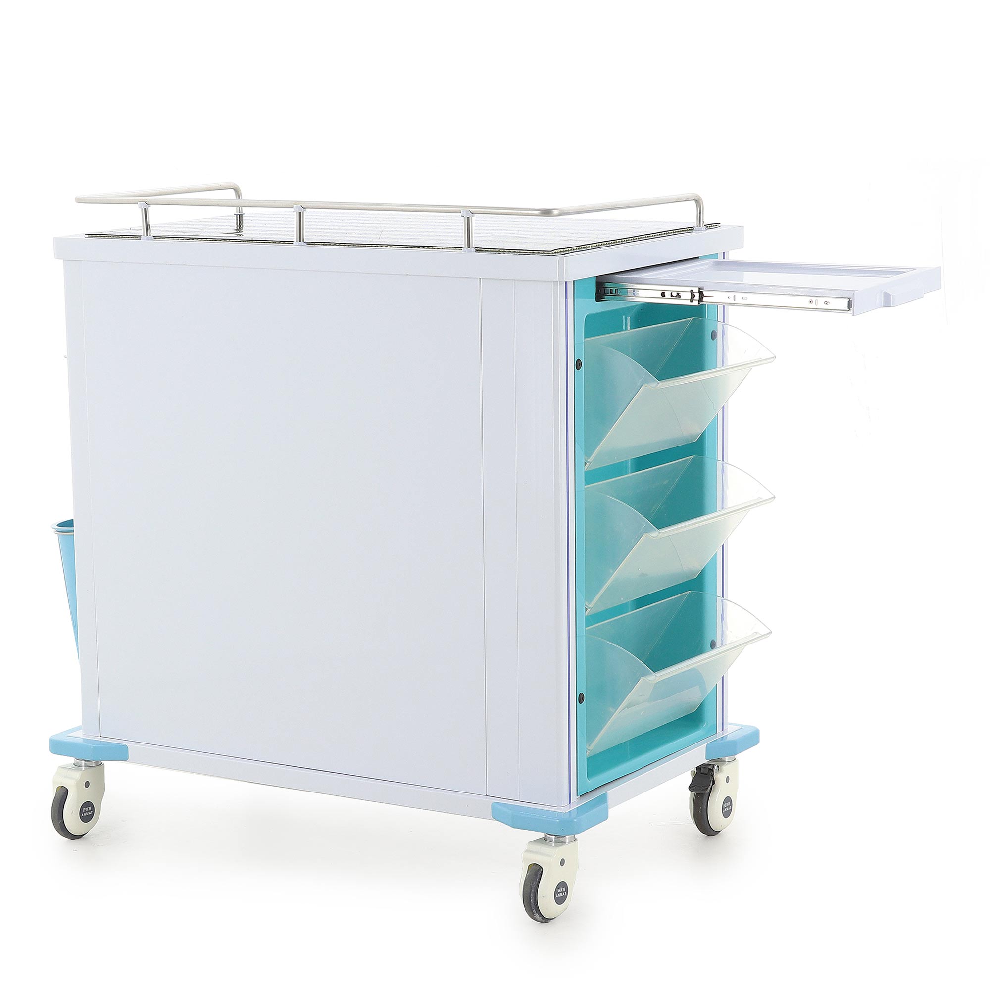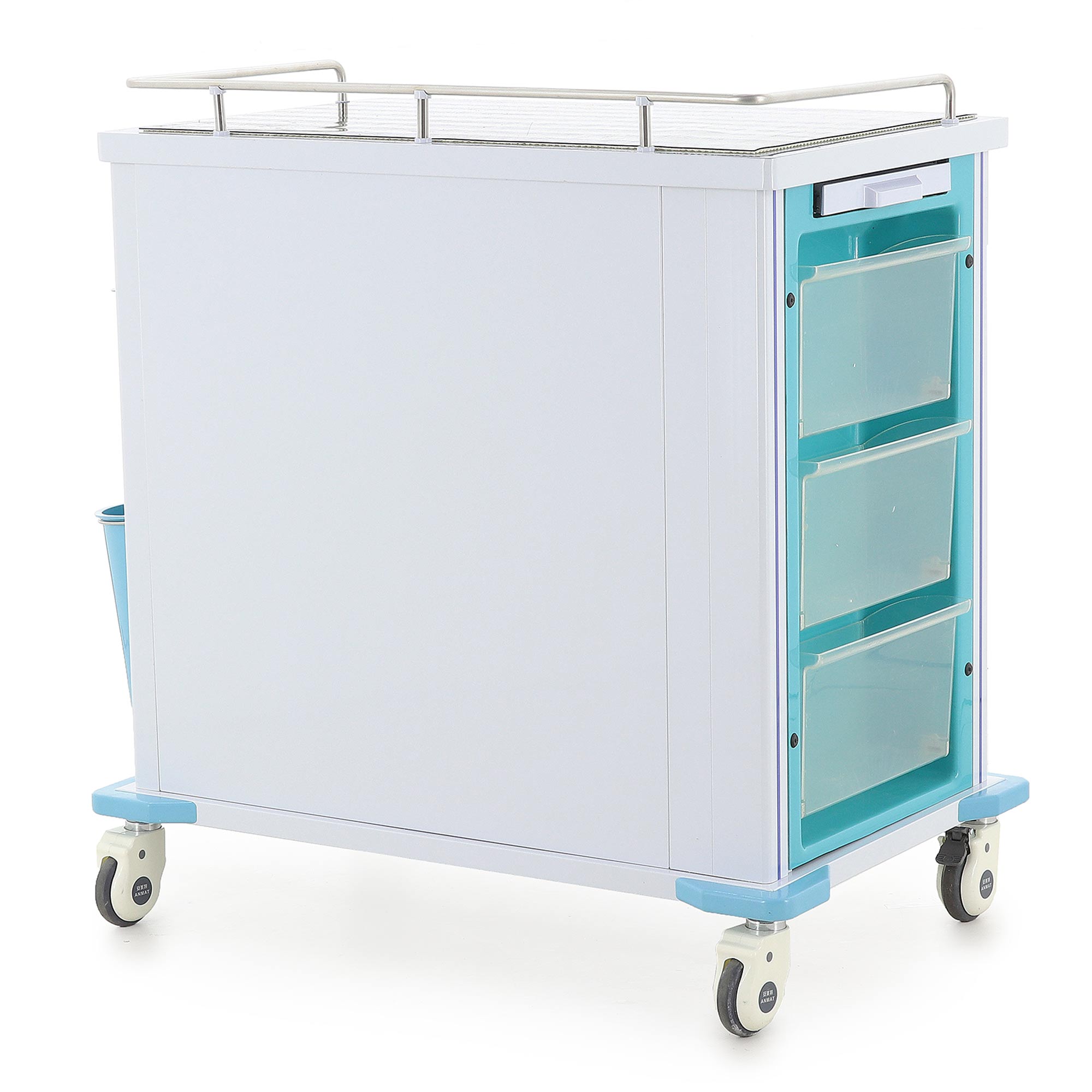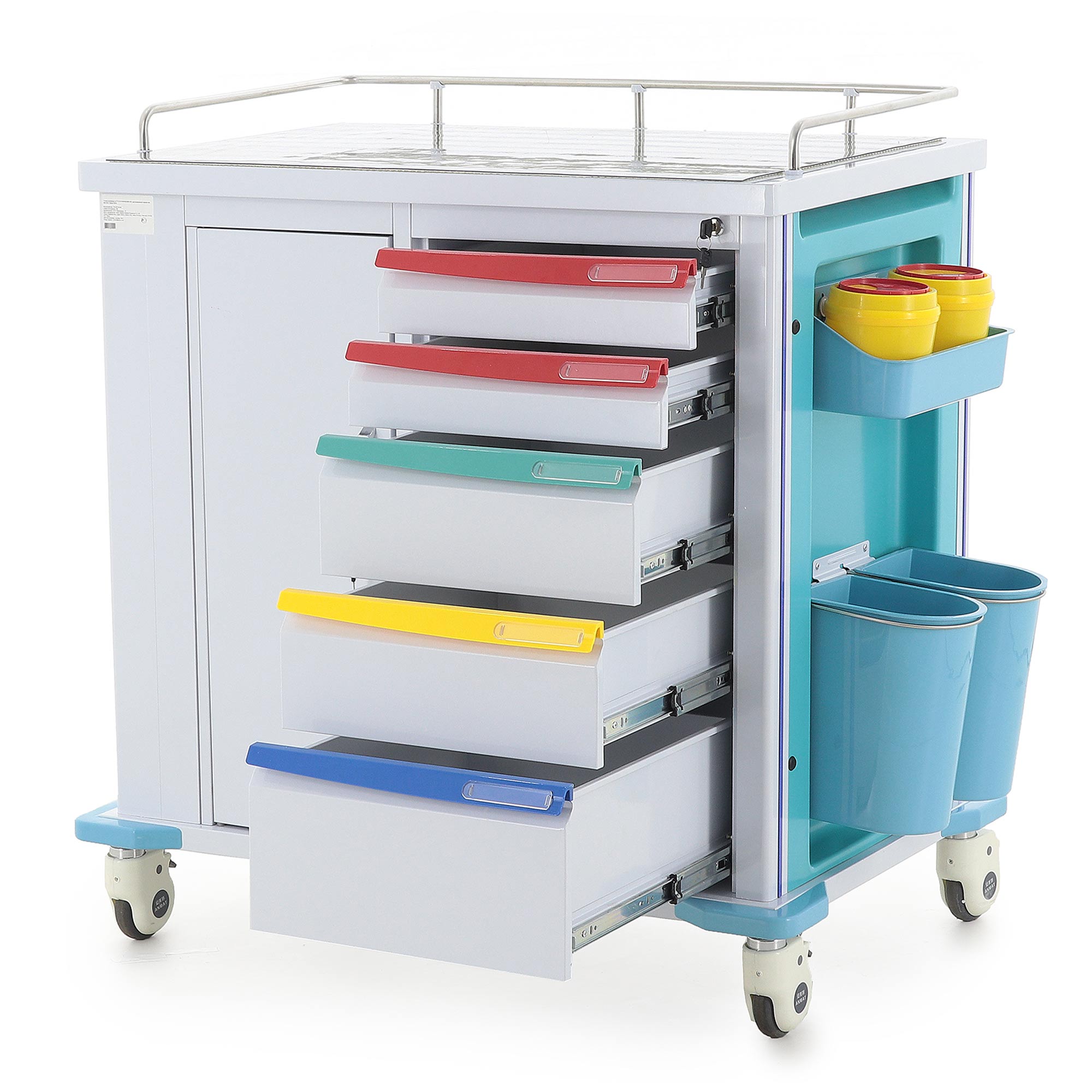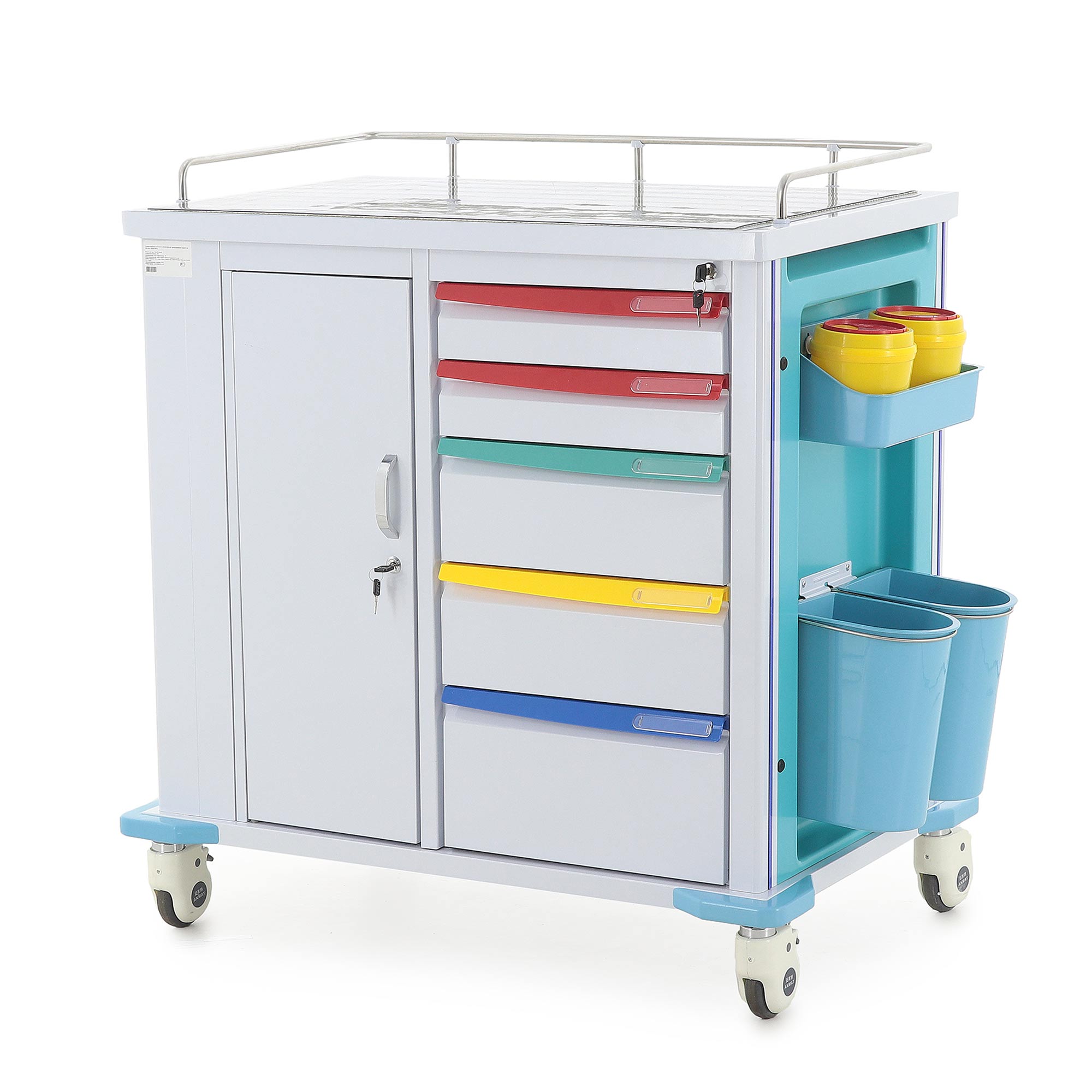 Медицинская тележка РМТ01 TM-007AH-01 разработана для выполнения терапевтических, процедурных и многофункциональных задач в медицинских учреждениях. Она оснащена пятью выдвижными ящиками с доводчиками и замком (закрывающим все ящики одновременно), одним отделением с дверкой и переставной полкой, а также восемью навесными ёмкостями (два ведра, две банки, три откидных контейнера, один лоток). Каркас включает стойки из алюминиевого профиля и стальной лист, покрытый ударопрочной эмалью, в бело-сером цвете с бирюзовыми акцентами. Столешница и основание выполнены из гнутого стального листа с эмалевым покрытием. Ящики изготовлены из ABS-пластика серого цвета с оттенком светло-фиолетового, с разноцветными ручками (красный, зелёный, жёлтый, синий) для удобной идентификации.