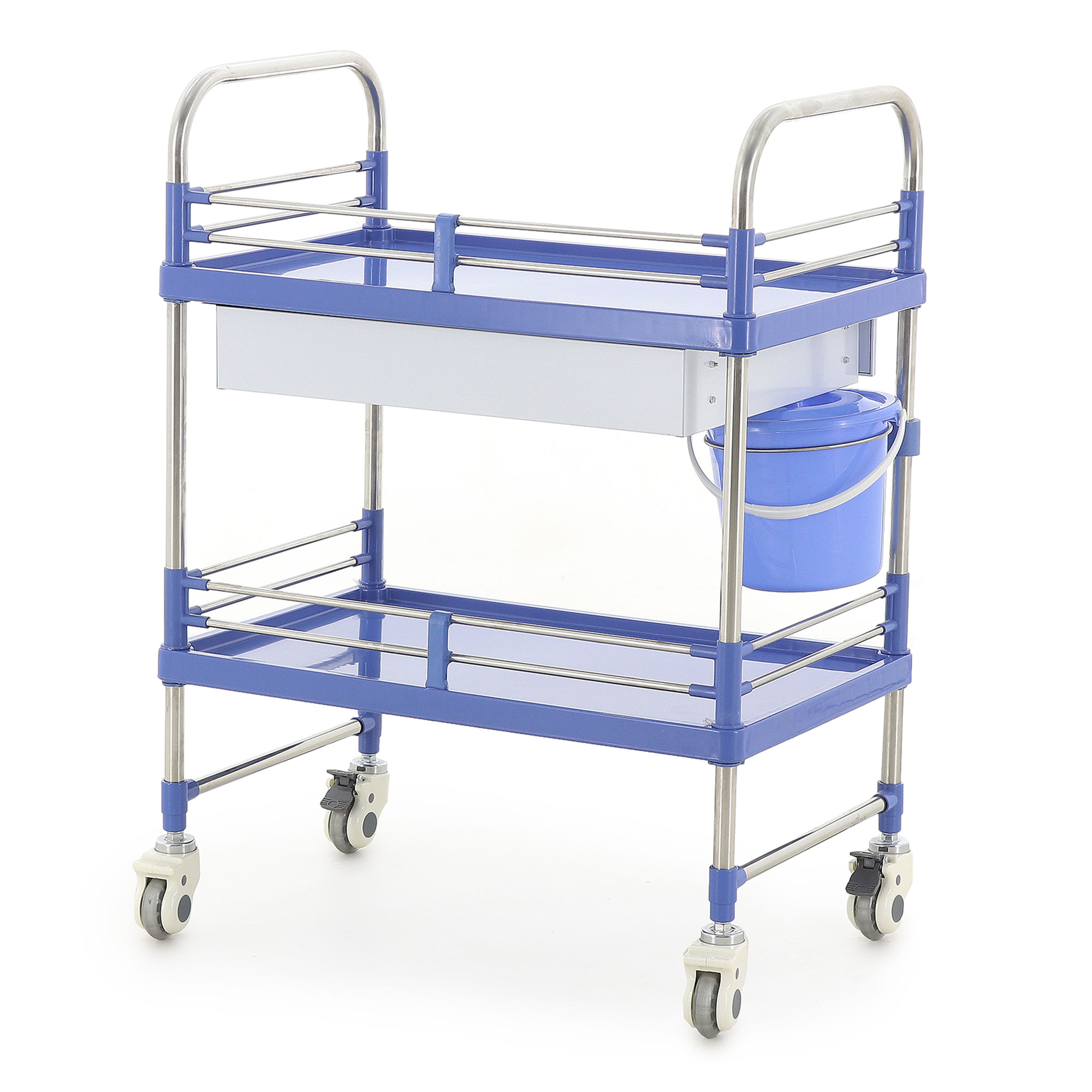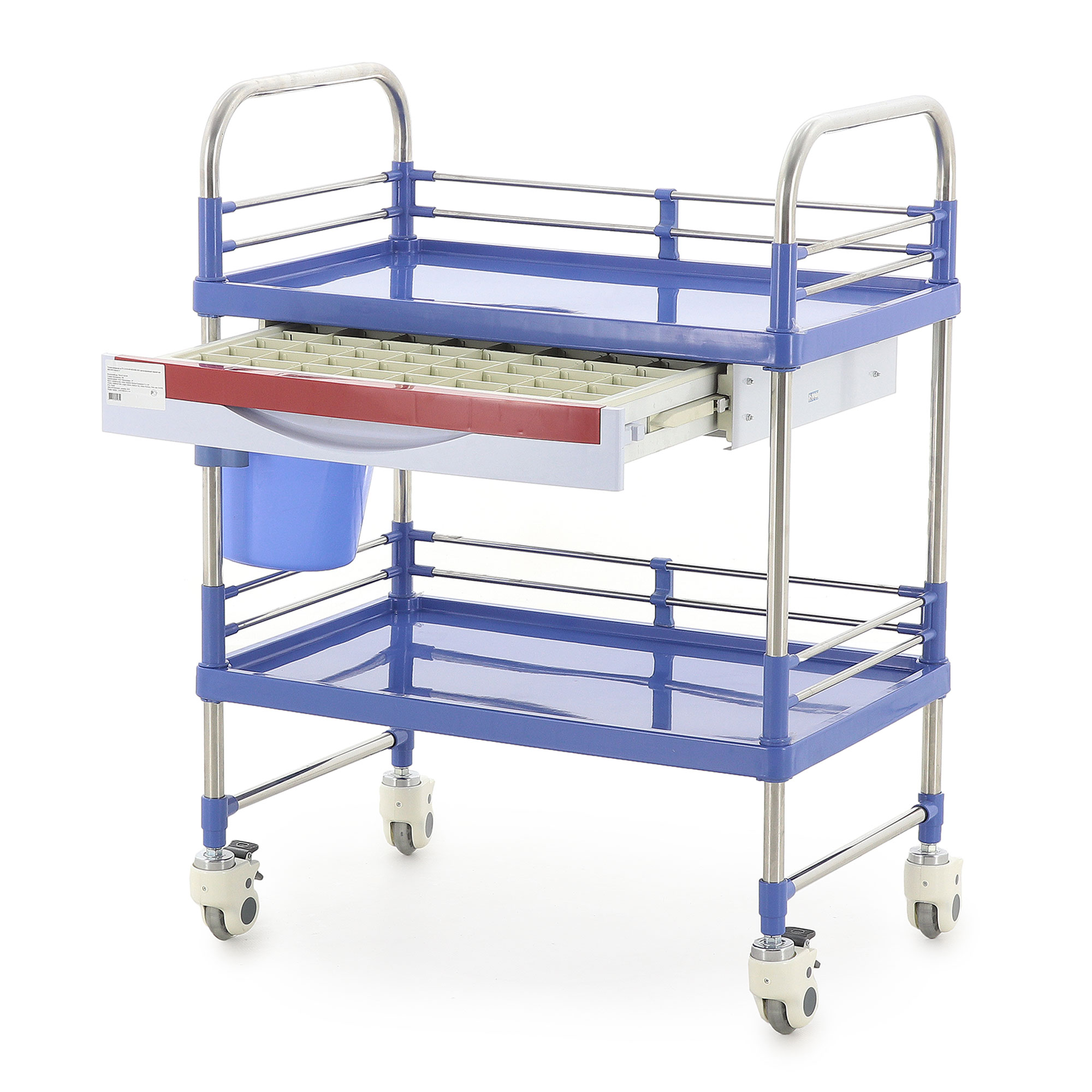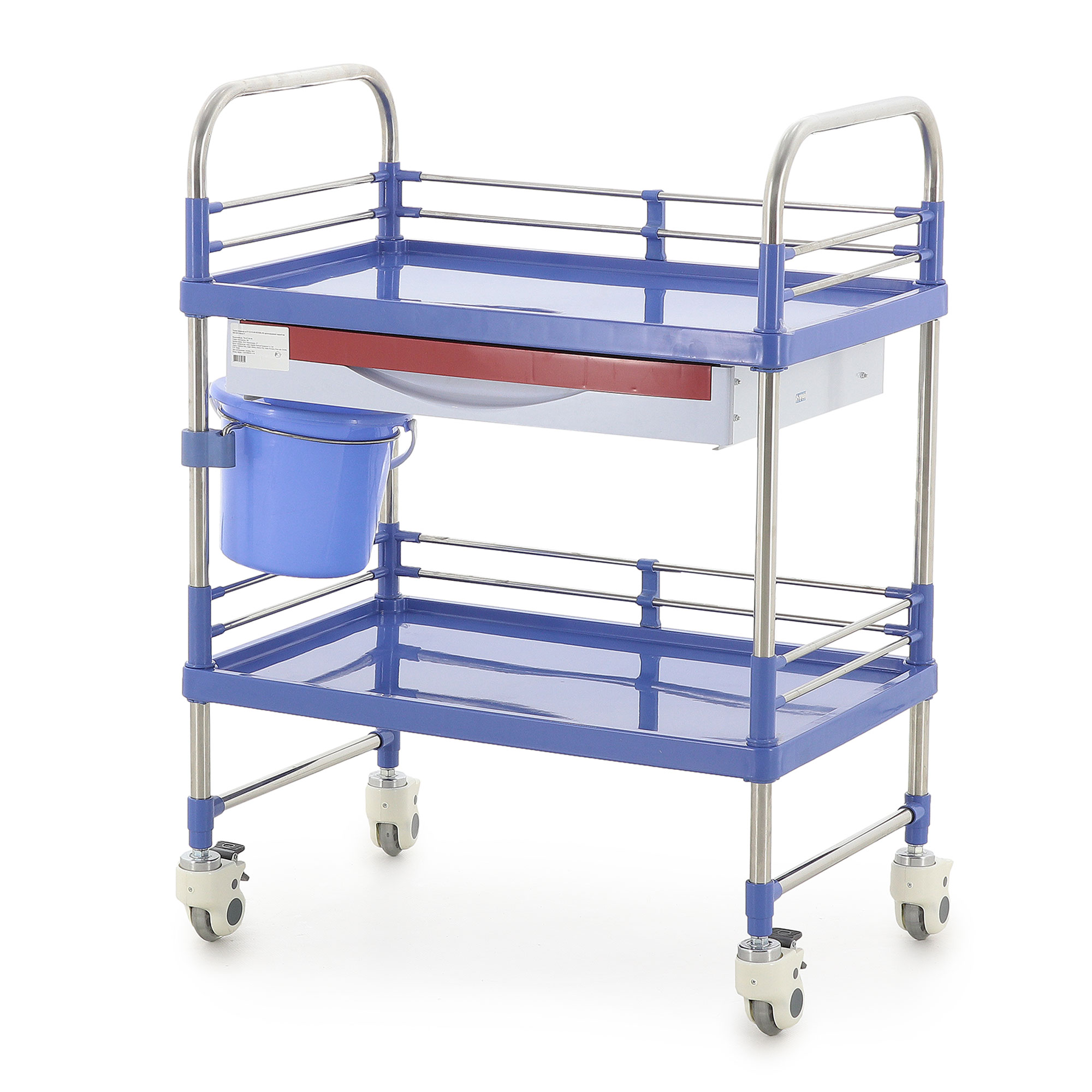 - Использования в качестве утилитарной тележки для различных медицинских задач благодаря двум ярусам, ящику и навесному ведру.