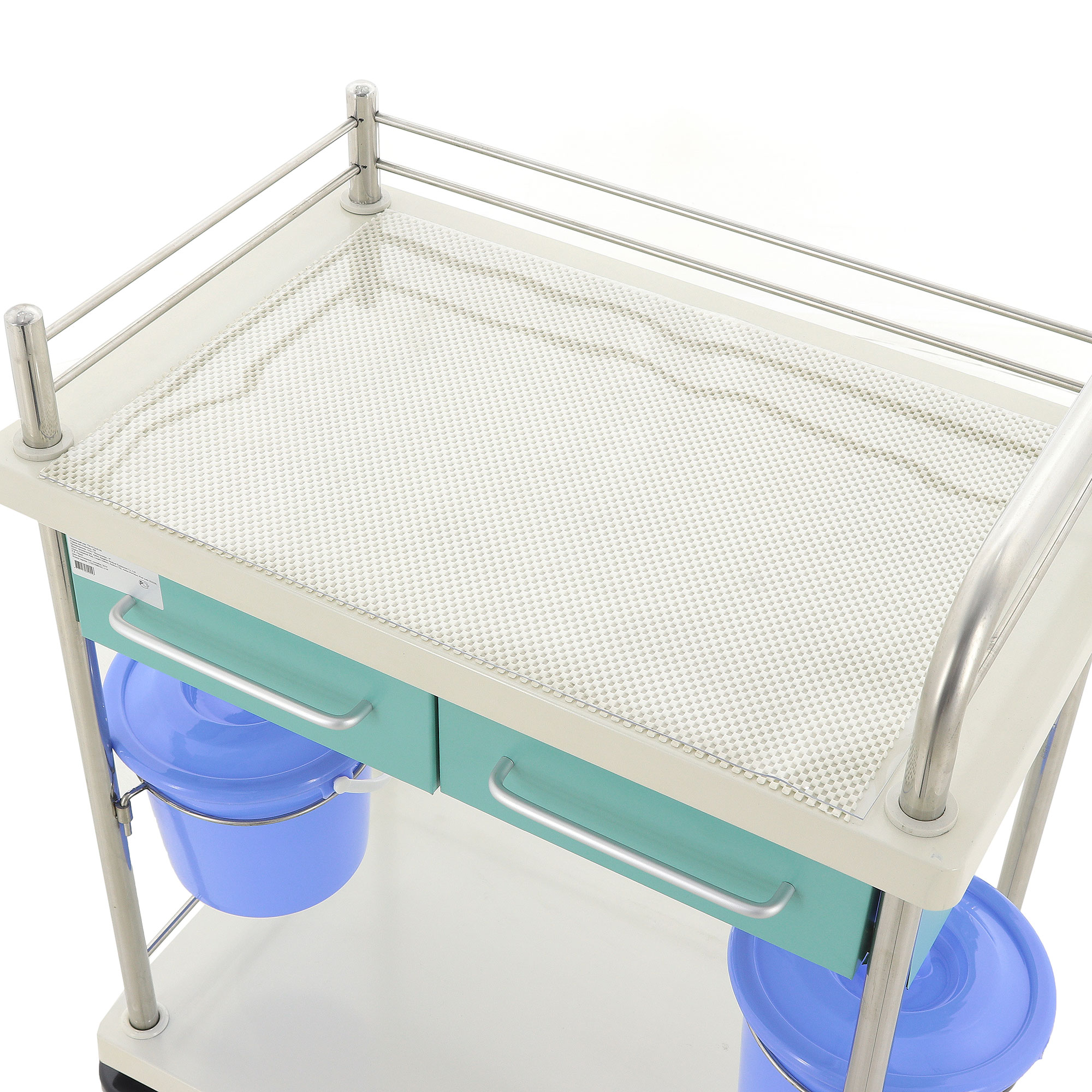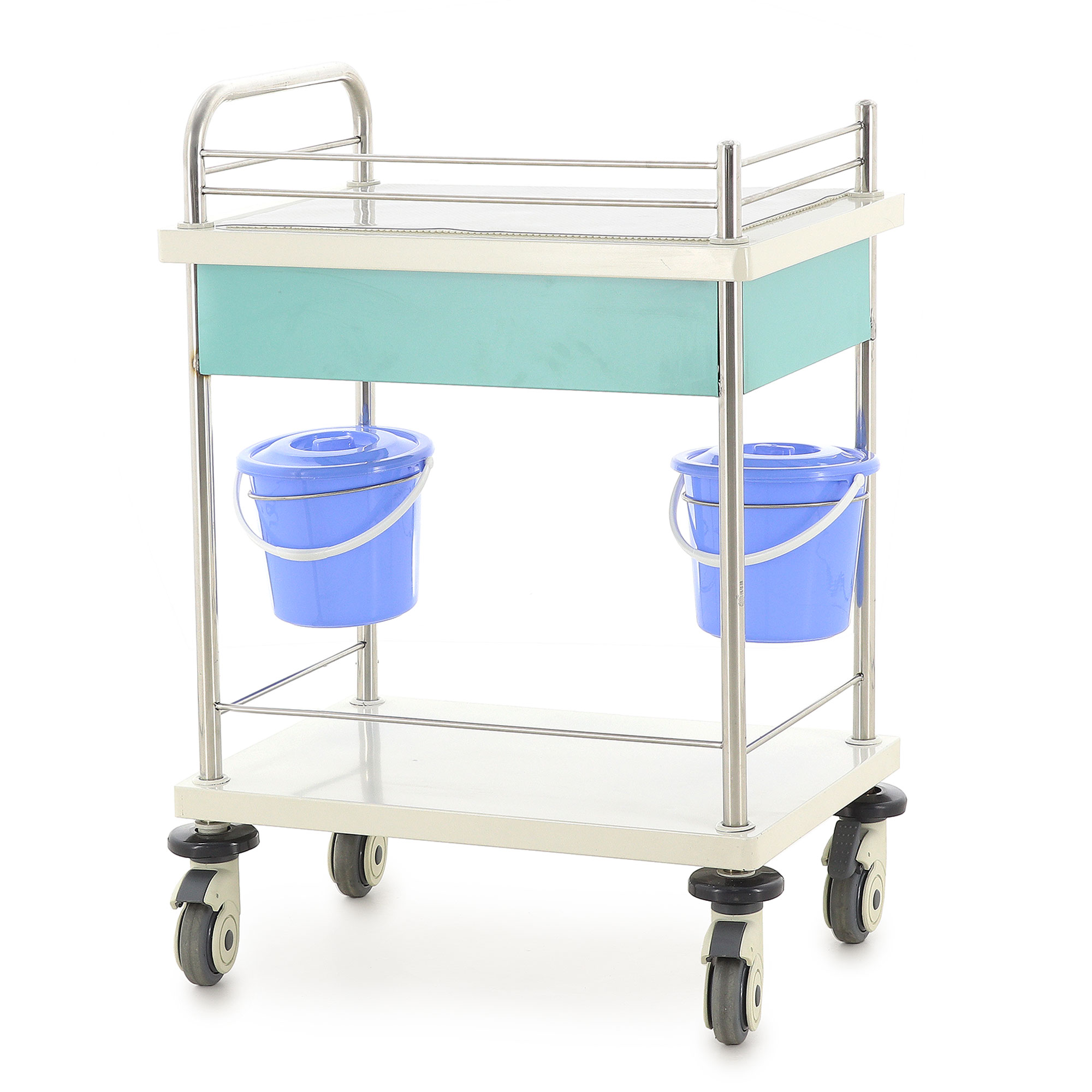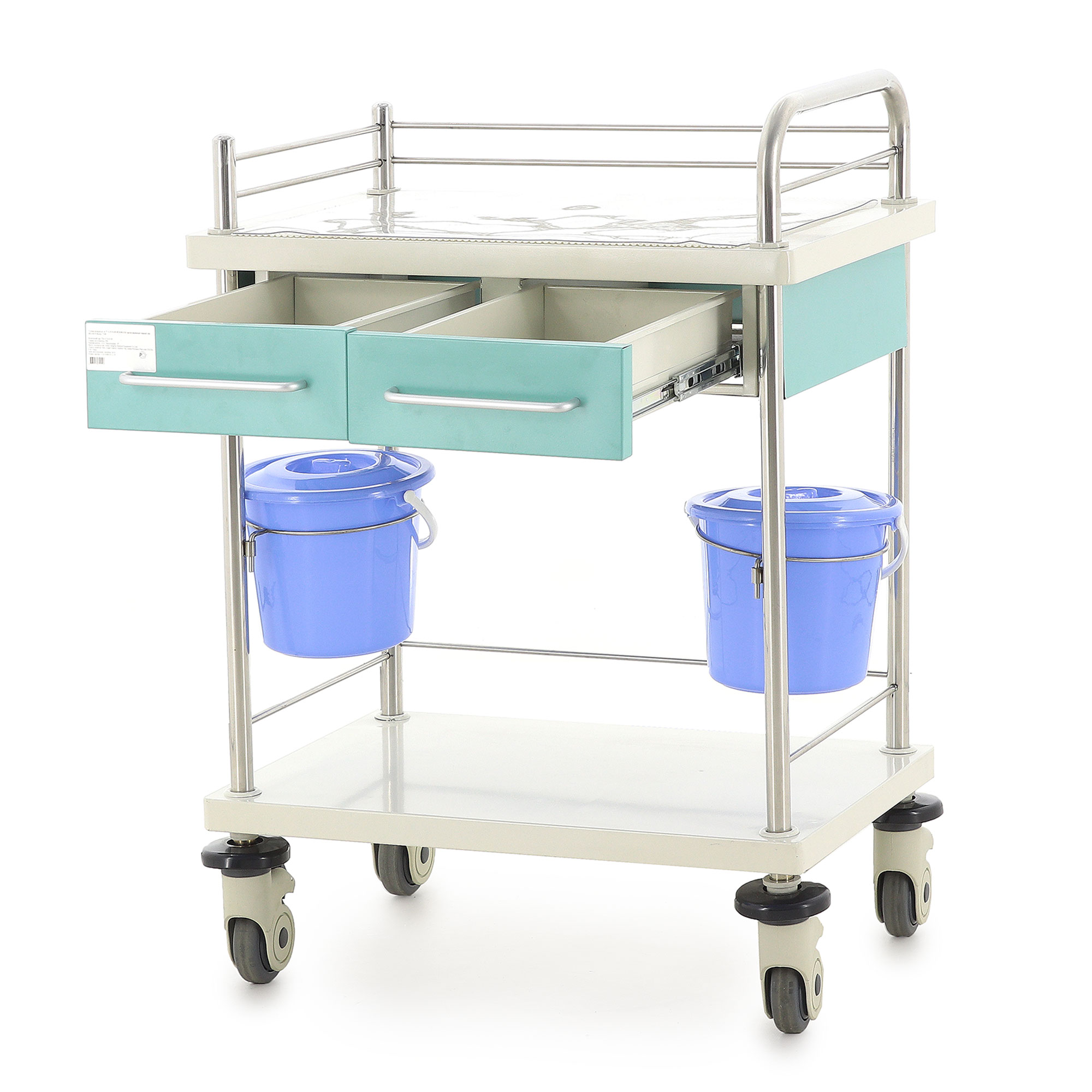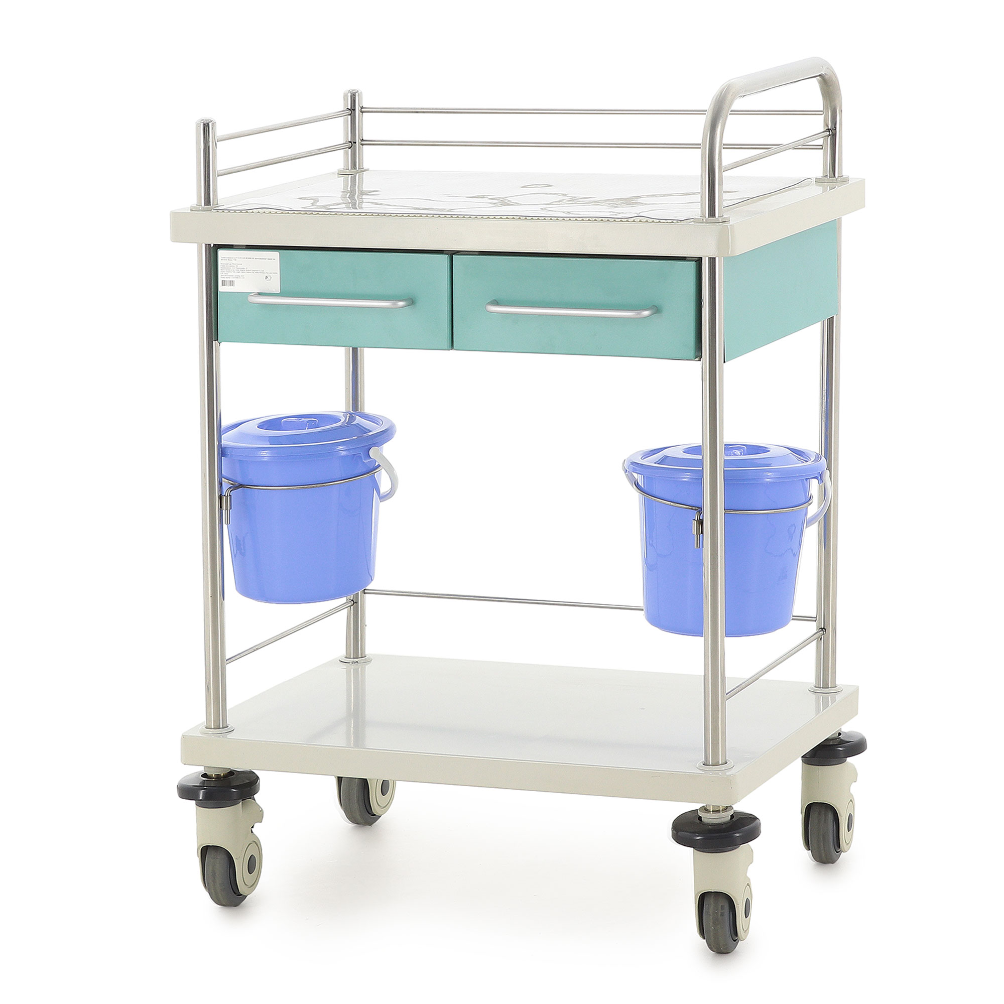 Медицинская тележка СТ008 TM-012AH-00 разработана для выполнения терапевтических, процедурных и многофункциональных задач в медицинских учреждениях. Она оснащена двумя выдвижными ящиками, двумя навесными вёдрами с крышками и П-образным ограждением на столешнице и основании из нержавеющей стали, предотвращающим падение предметов. Каркас и столешница выполнены из гнутого стального листа с ударопрочной эпоксидной эмалью, а стойки из нержавеющей стали обеспечивают прочность и долговечность.