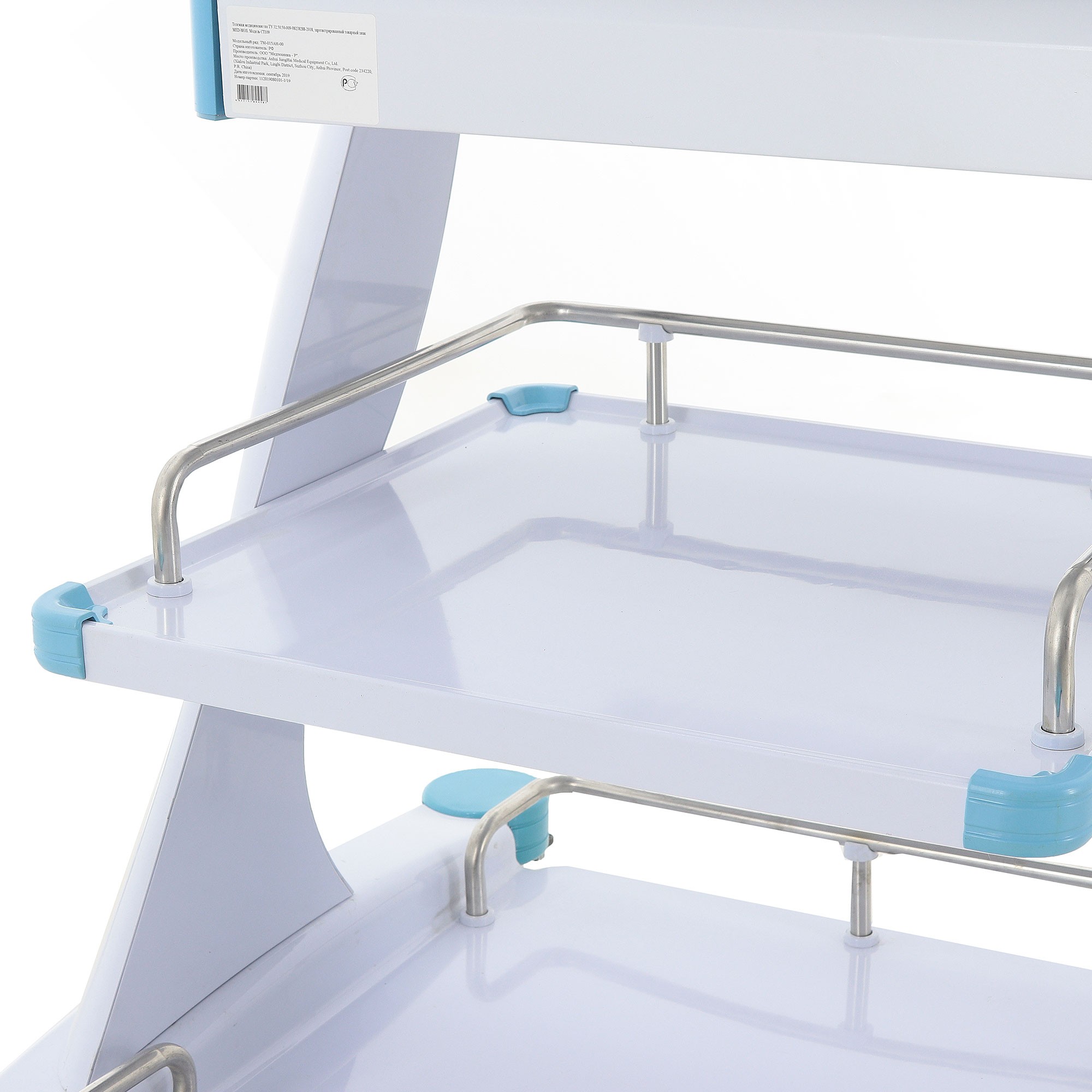 Медицинская тележка СТ109 TM-015AH-00 разработана для выполнения терапевтических, процедурных и многофункциональных задач в медицинских учреждениях. Она оснащена одним выдвижным ящиком с ковриком из вспененного материала, тремя ярусами (основание, полка и столешница) с П-образными ограждениями из нержавеющей стали и держателем для бутылей _ 80 мм на столешнице. Каркас выполнен из пластика белого и светло-фиолетового цветов, а ящик — из гнутого стального листа с ударопрочной эпоксидной эмалью.