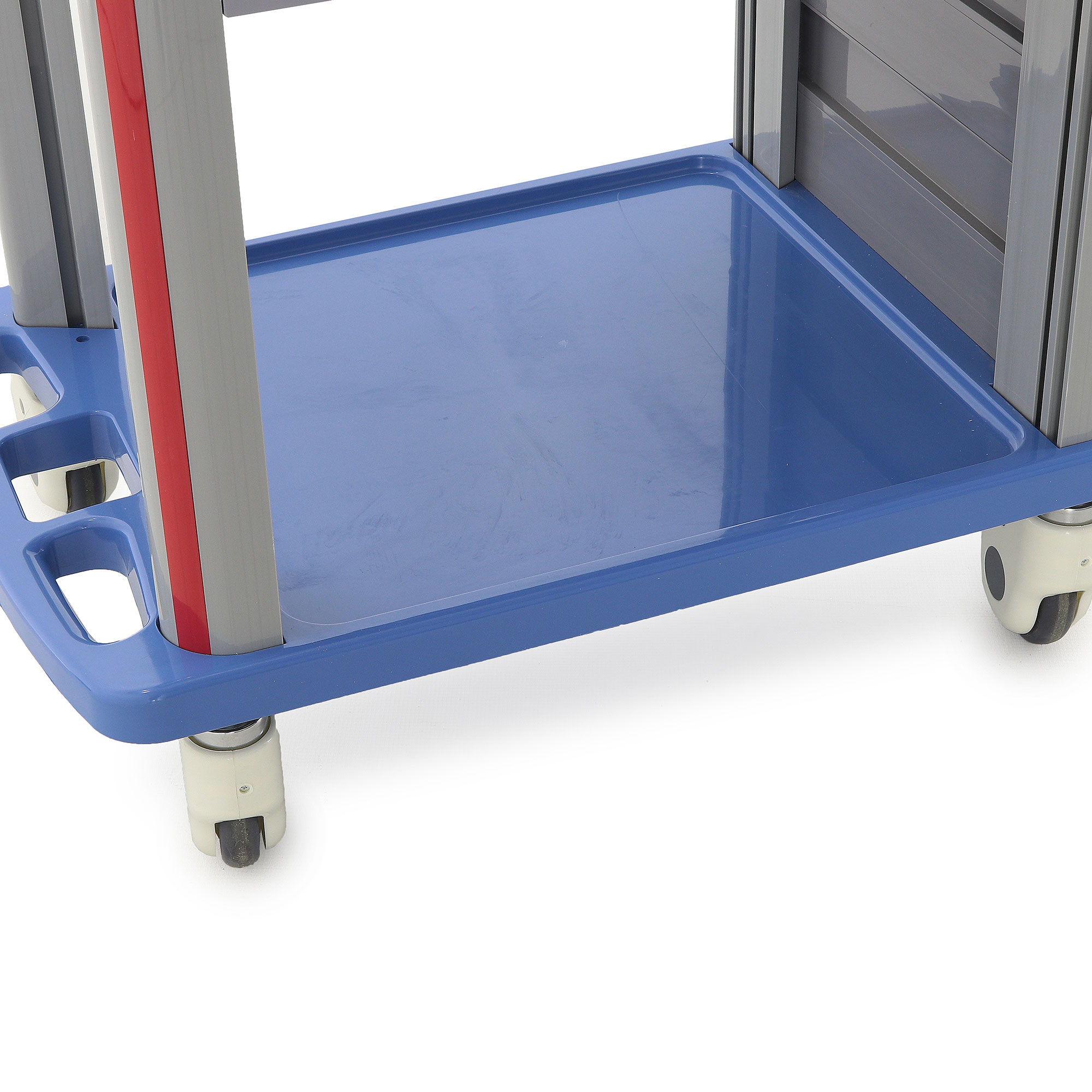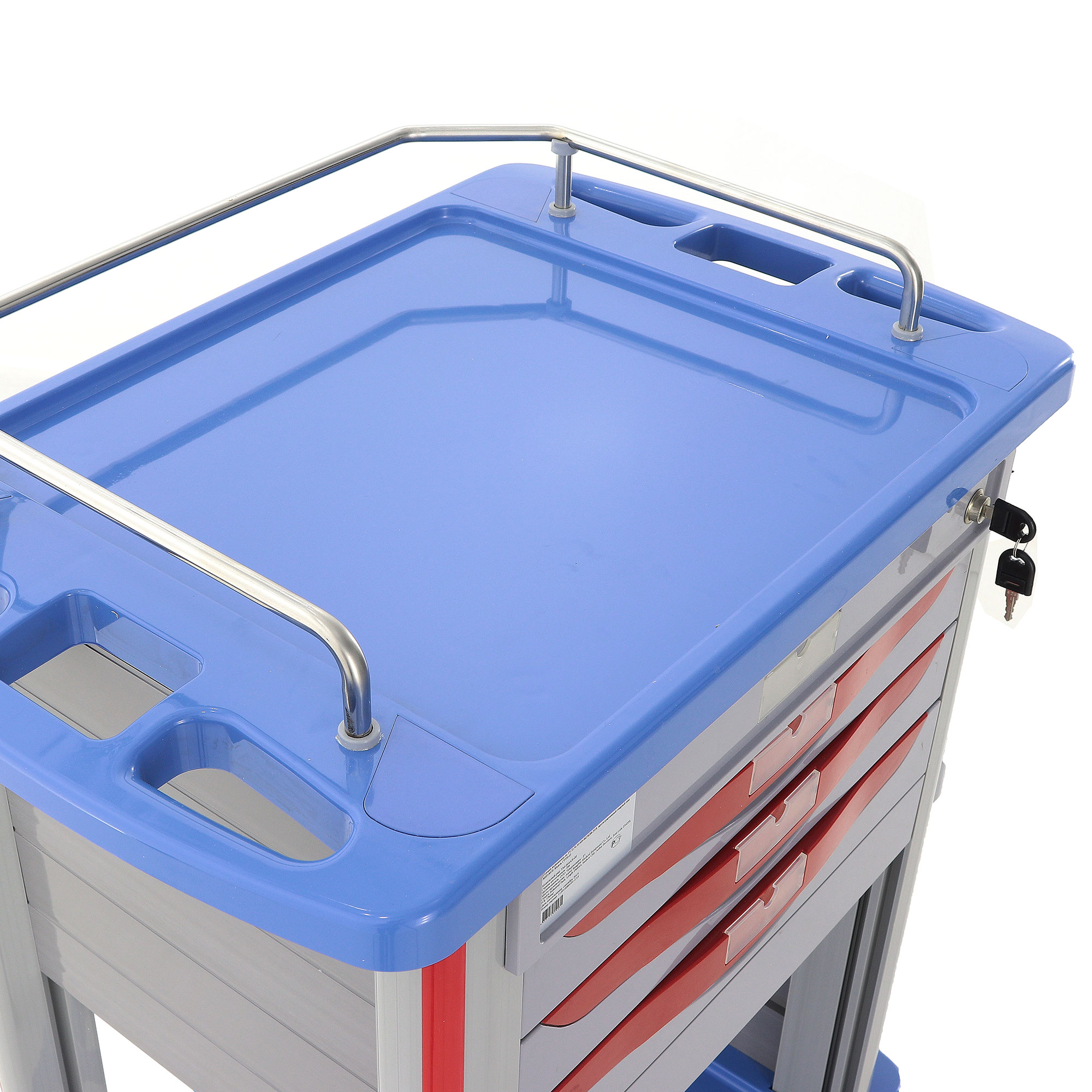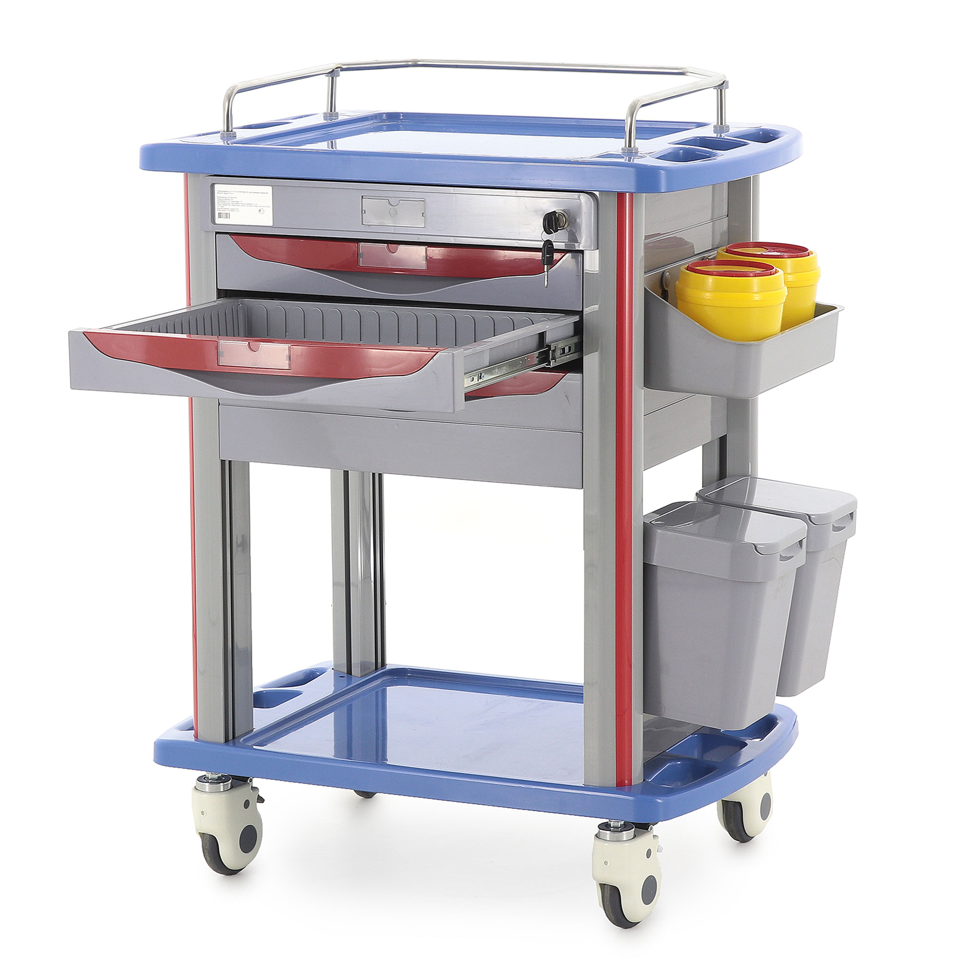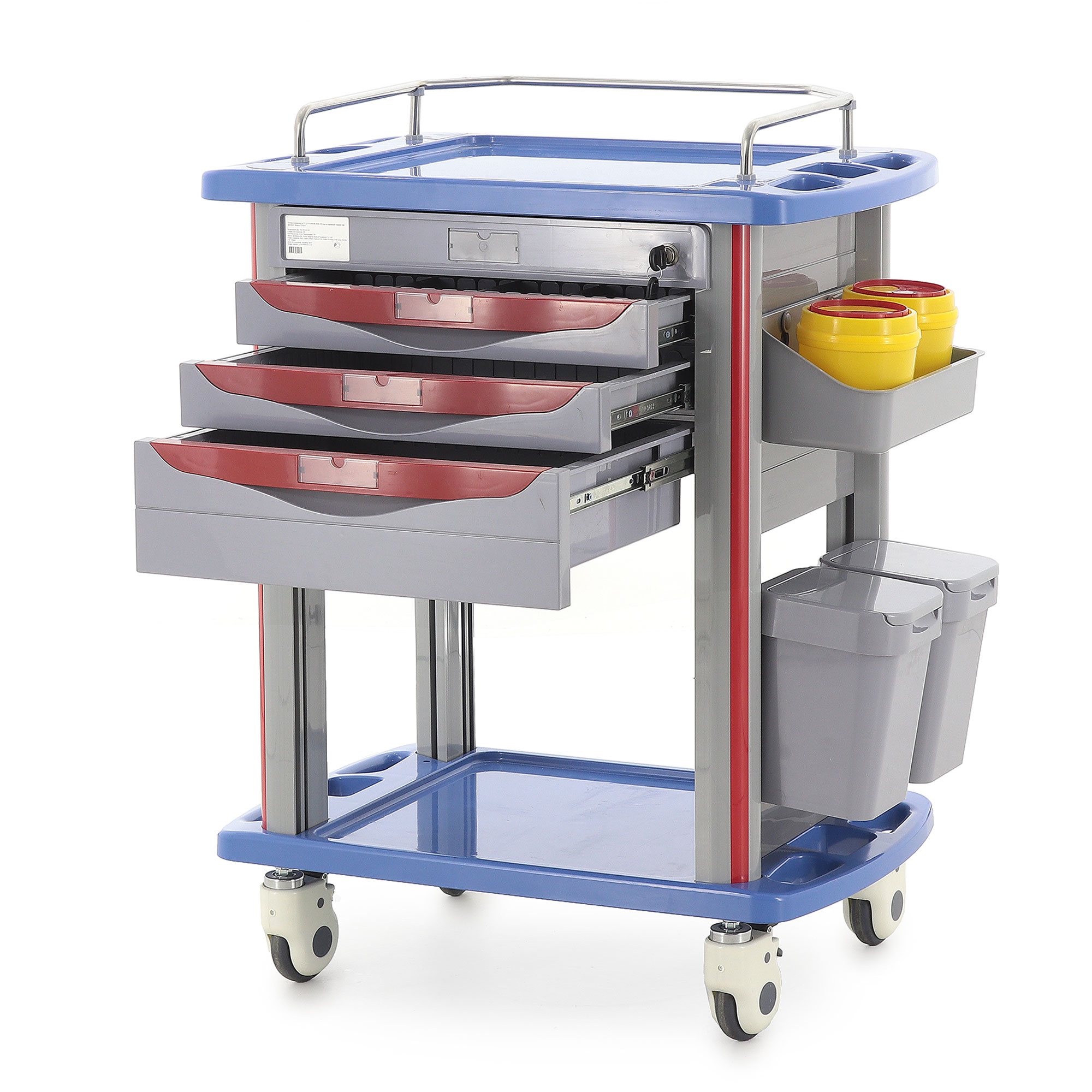 Медицинская тележка СT750-03 TM-004AH-00 разработана для выполнения терапевтических, процедурных и многофункциональных задач в медицинских учреждениях. Она оснащена тремя выдвижными ящиками с 18 съёмными перегородками и замком на верхнем ящике, а также пятью навесными ёмкостями (два ведра, две банки и лоток). Каркас и столешница выполнены из пластика синего цвета, стойки — из пластикового профиля серого цвета с красными вставками, а ящики — из пластика серого цвета с красными ручками.