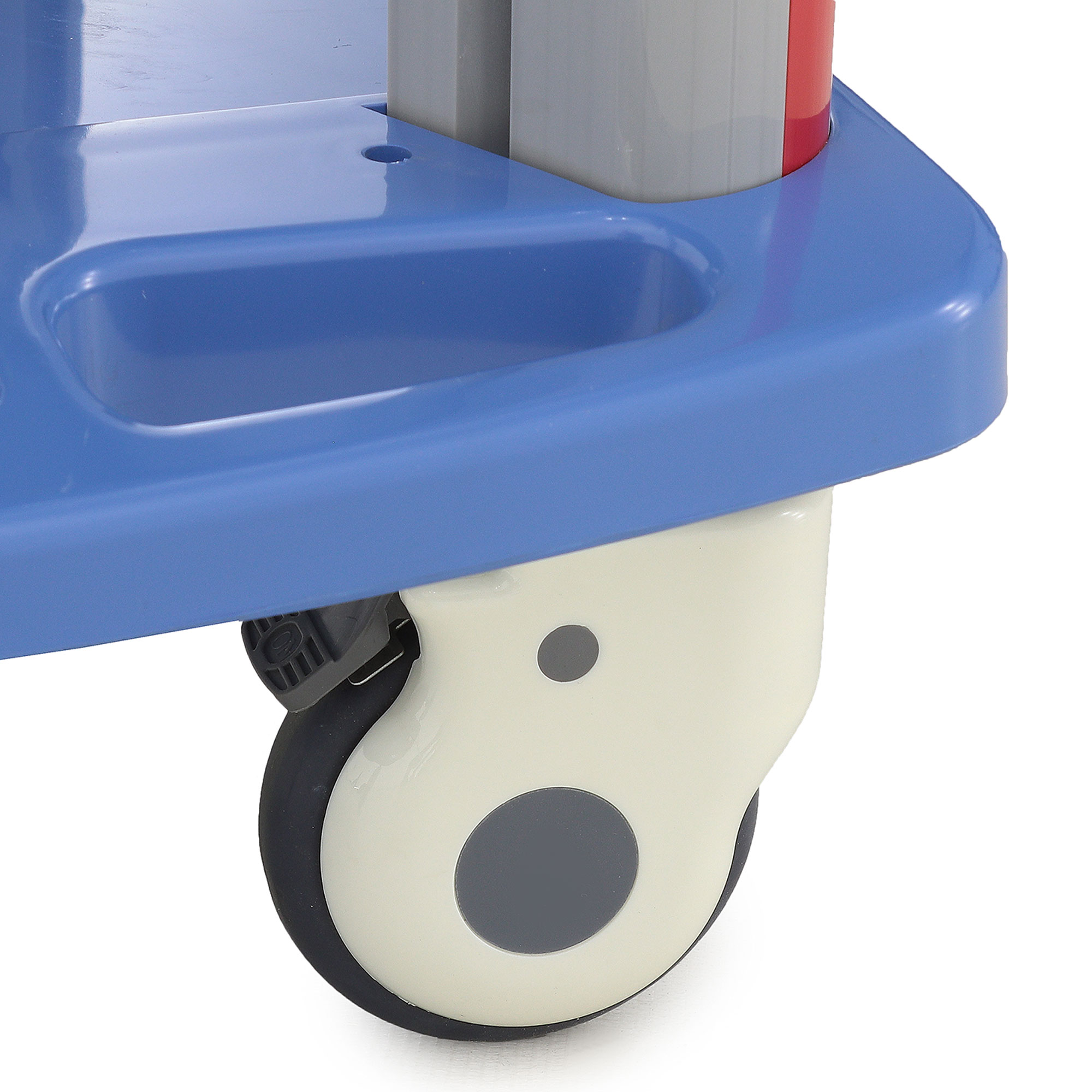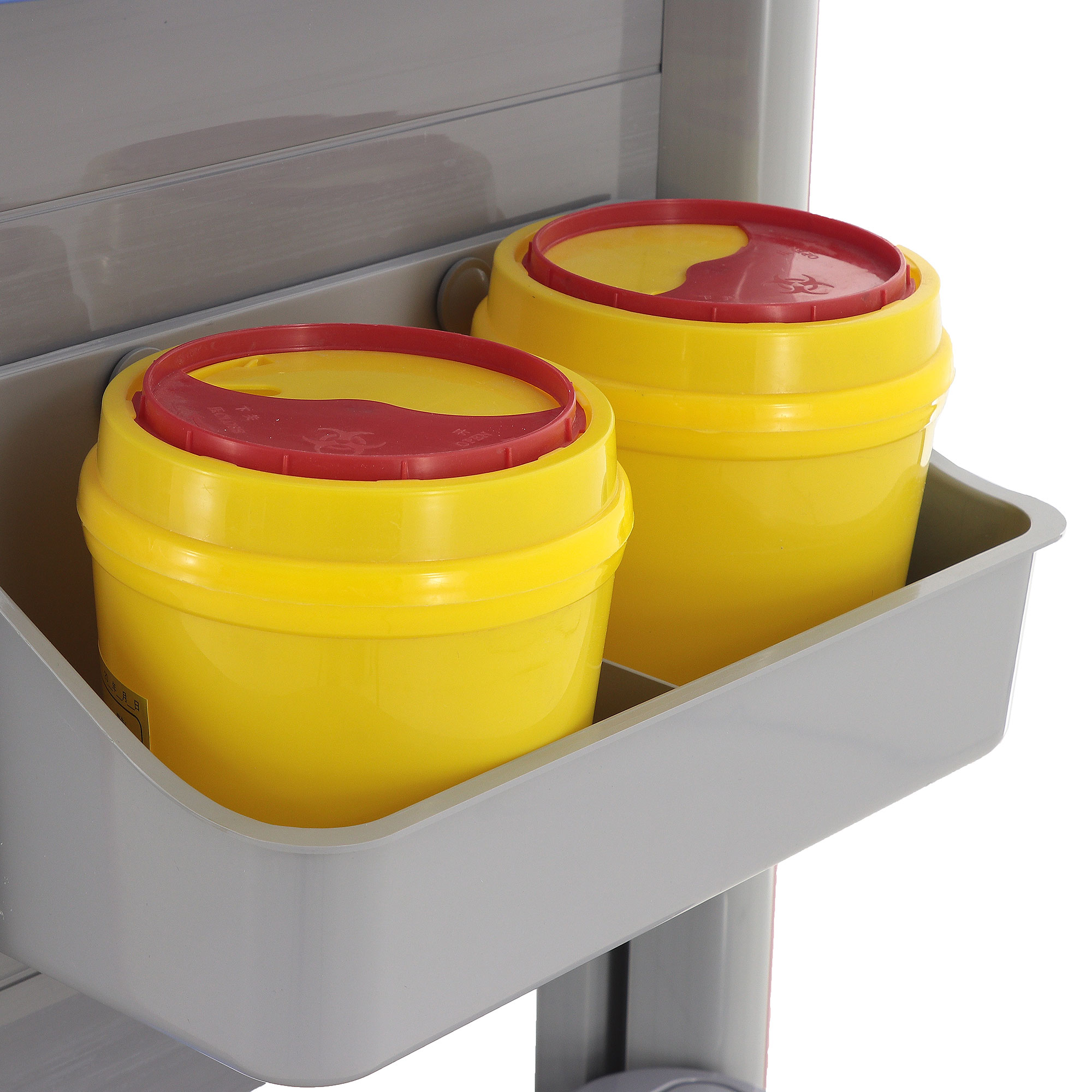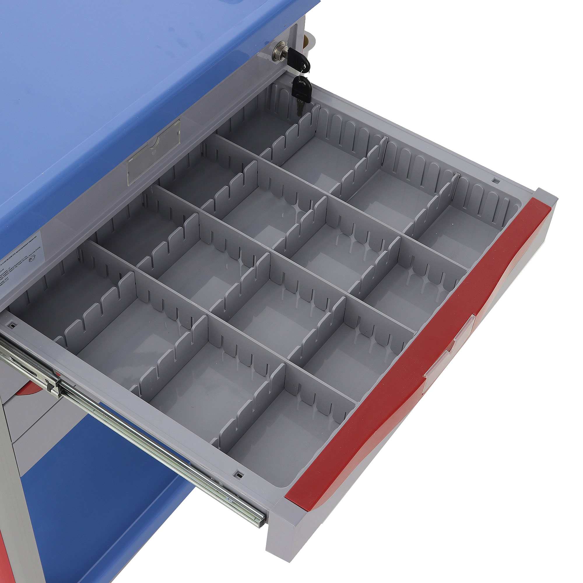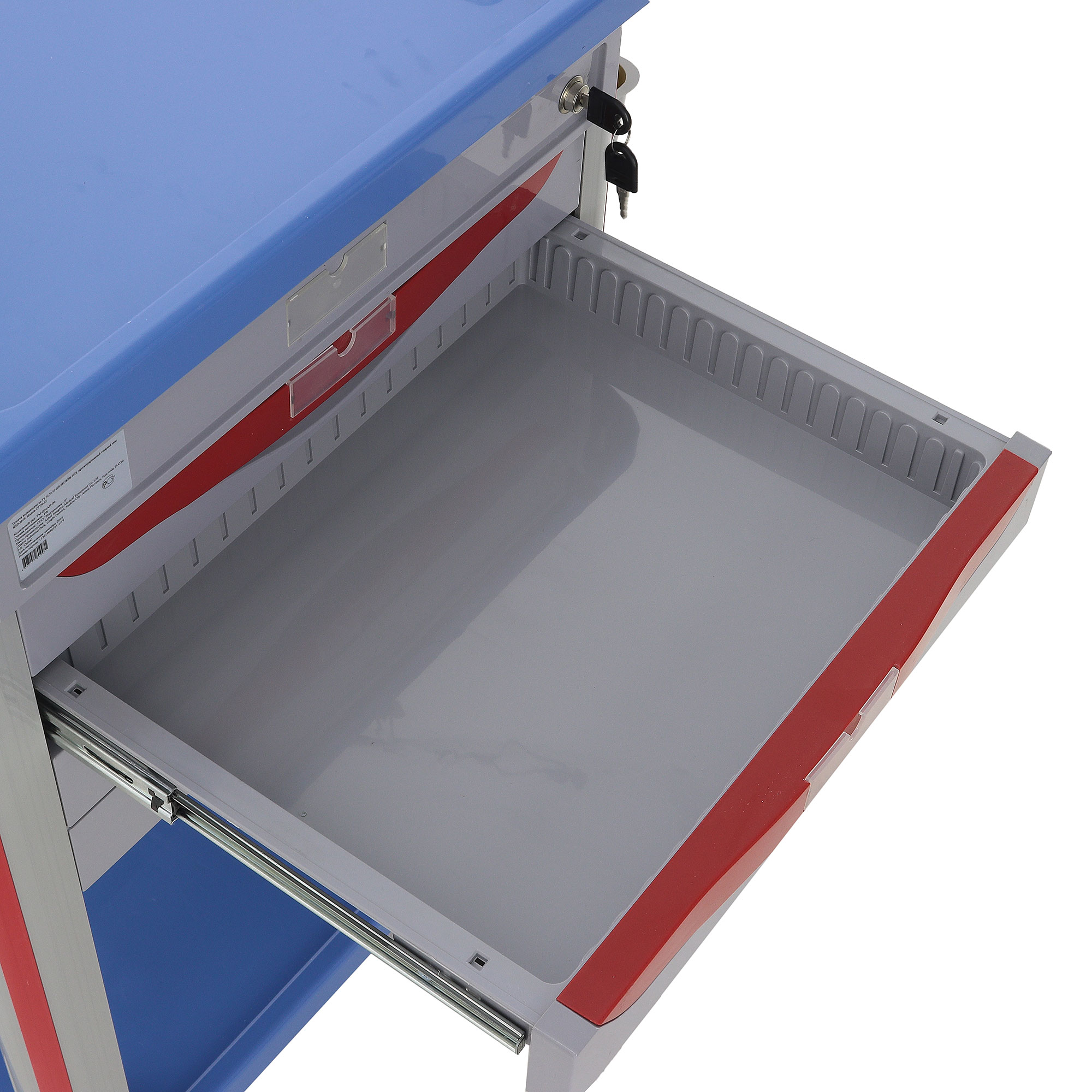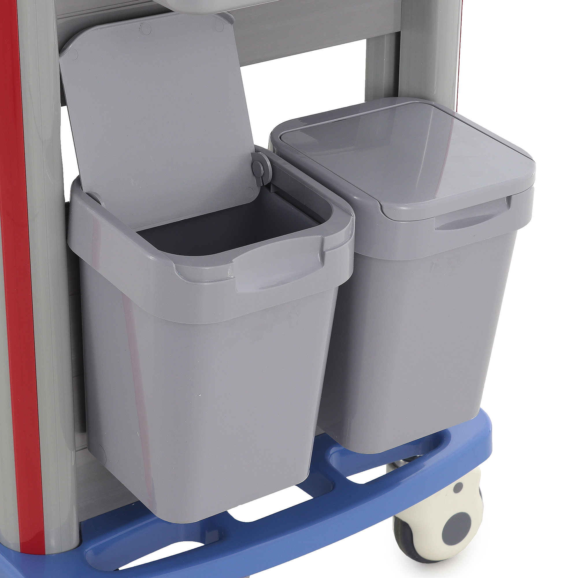 Медицинская тележка СT750-03 TM-004AH-00 разработана для выполнения терапевтических, процедурных и многофункциональных задач в медицинских учреждениях. Она оснащена тремя выдвижными ящиками с 18 съёмными перегородками и замком на верхнем ящике, а также пятью навесными ёмкостями (два ведра, две банки и лоток). Каркас и столешница выполнены из пластика синего цвета, стойки — из пластикового профиля серого цвета с красными вставками, а ящики — из пластика серого цвета с красными ручками.