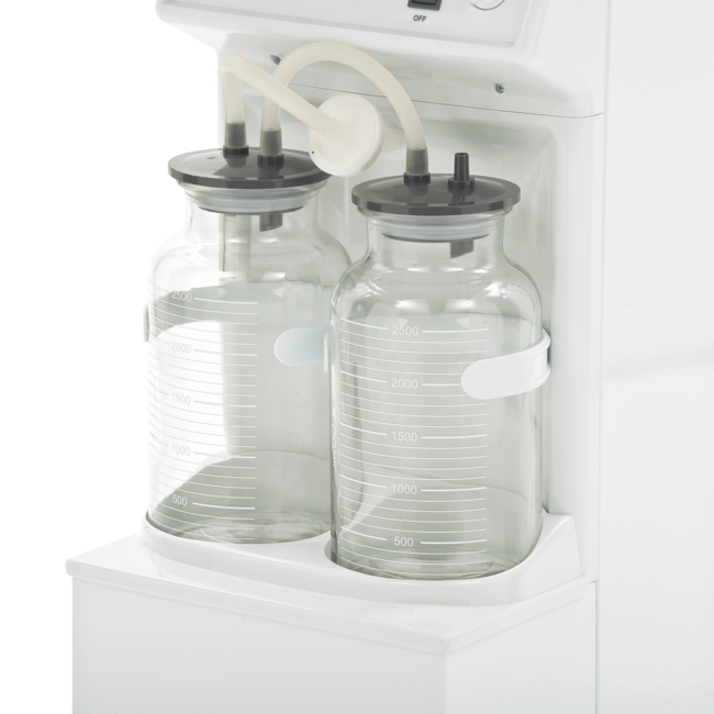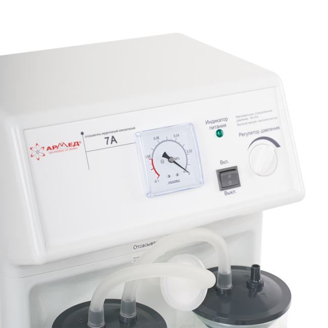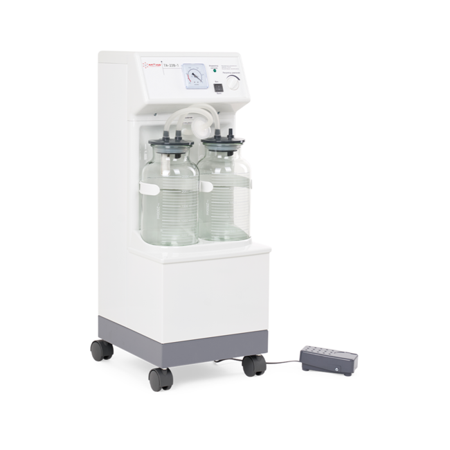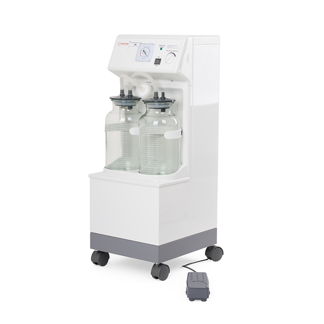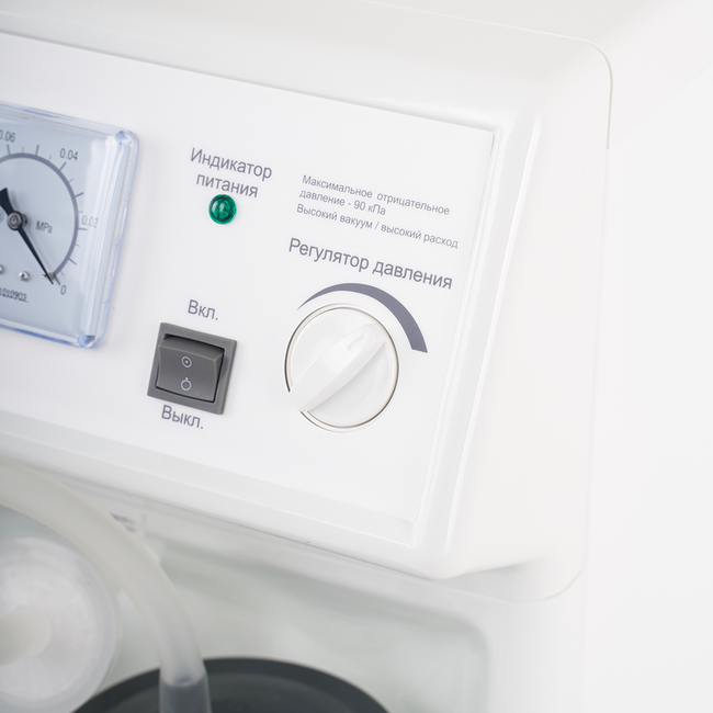 Прибор отличается возможностью непрерывной работы в течение 4 часов, сохраняя высокую производительность - в 40 л/мин. Это делает его востребованным в хирургии и операционных отделениях стационара. Управление аспиратором может осуществляться с помощью ножной педали, что особенно важно при проведении операций. В комлпектацию входит металлический наконечник, необходимый при полостных операциях.