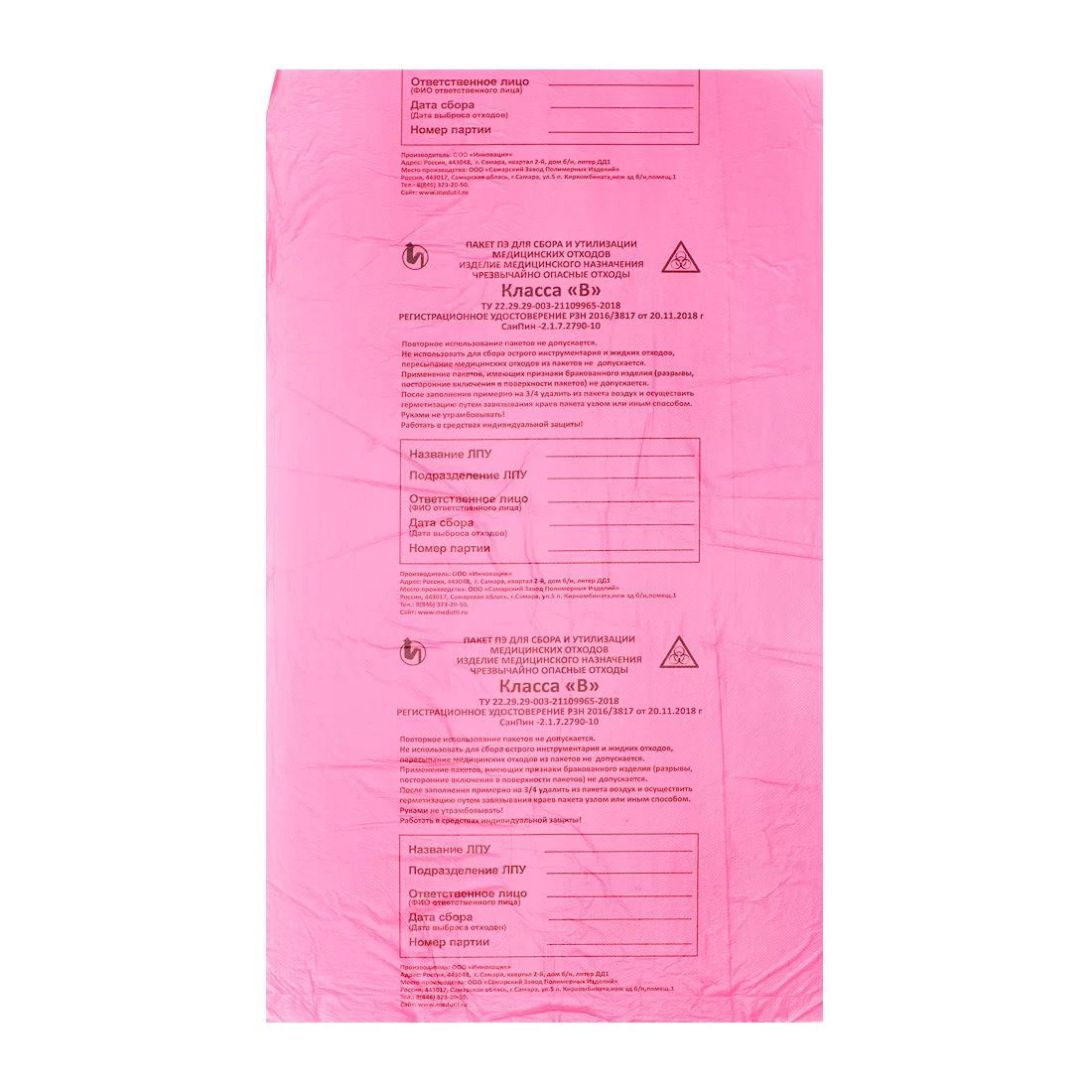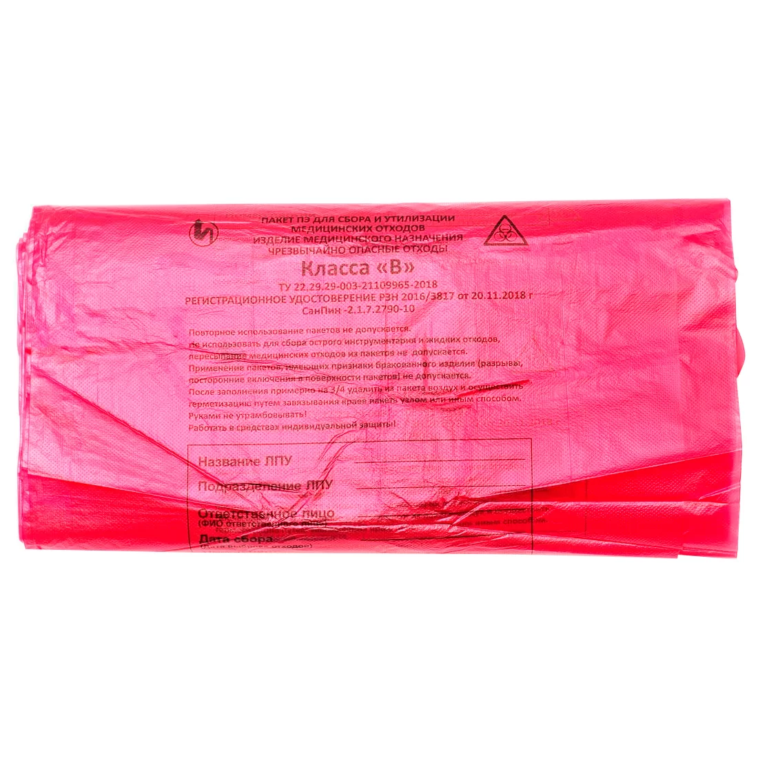 Пакет ПЭ для сбора медицинских отходов класса В (чрезвычайно опасные отходы).