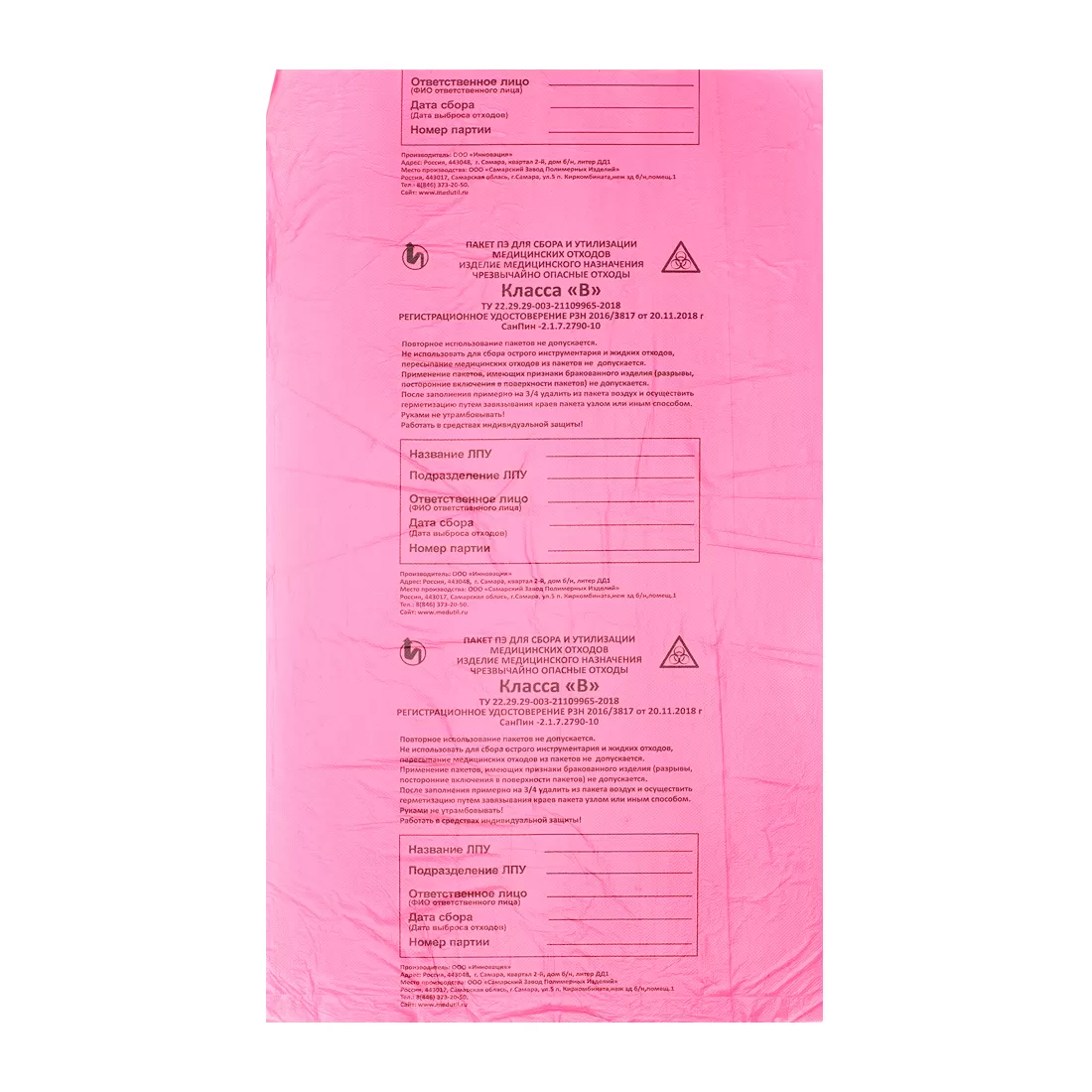 Не используйте пакет повторно и не пересыпайте медицинские отходы из пакета; в пакет нельзя складывать острый инструментарий и сливать жидкие отходы. Не используйте пакеты с разрывами, посторонними включениями в поверхность и другими признаками брака.