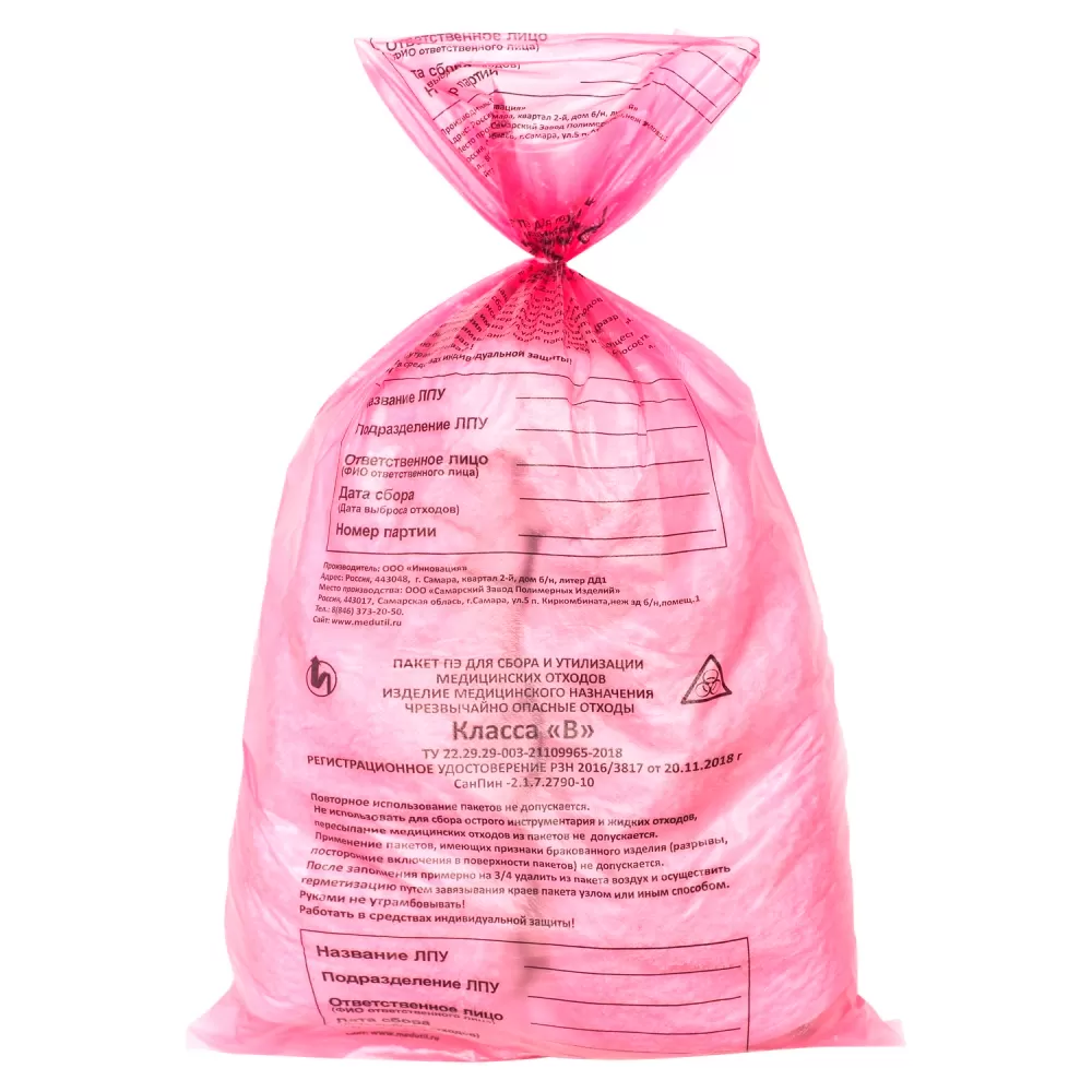 Не используйте пакет повторно и не пересыпайте медицинские отходы из пакета; в пакет нельзя складывать острый инструментарий и сливать жидкие отходы. Не используйте пакеты с разрывами, посторонними включениями в поверхность и другими признаками брака.