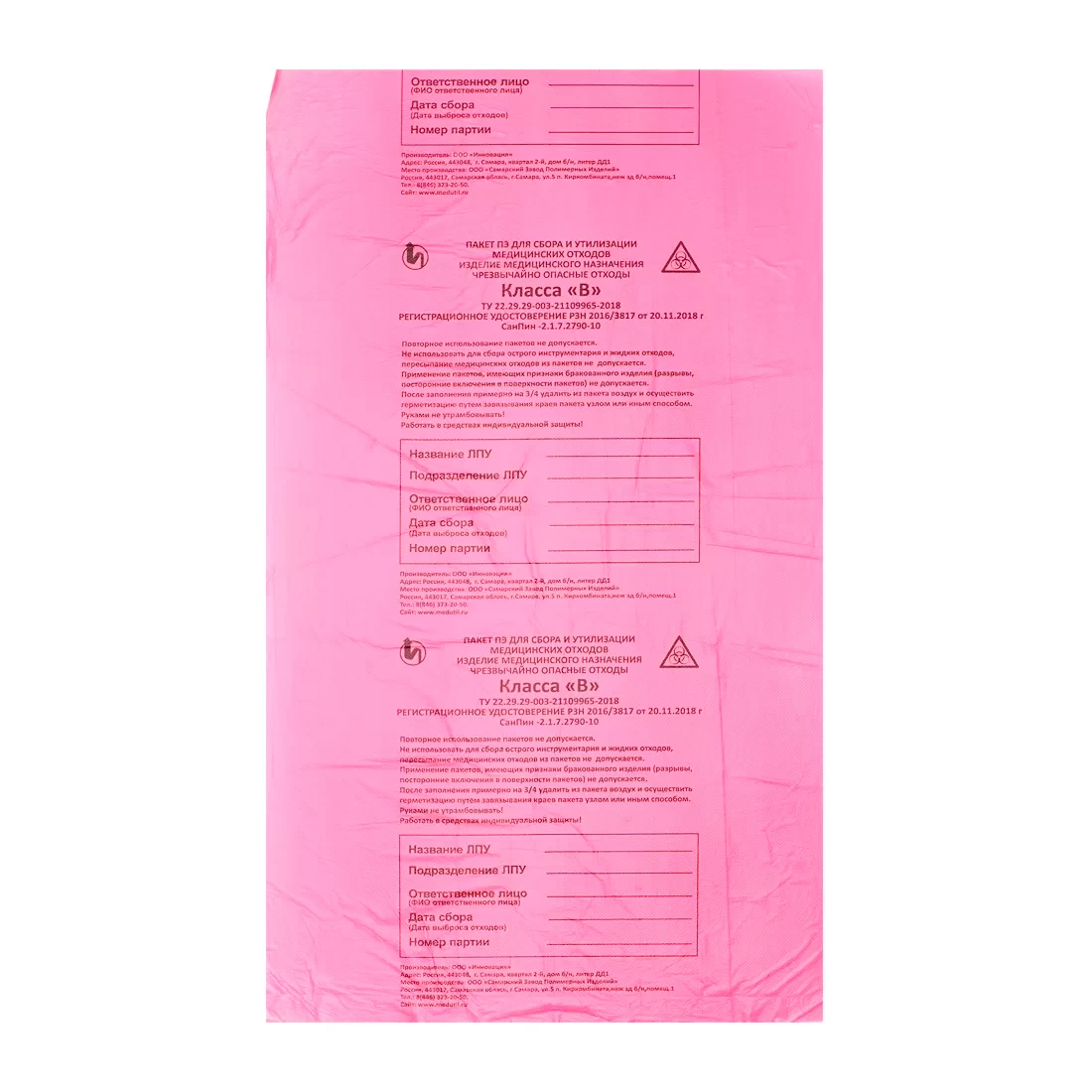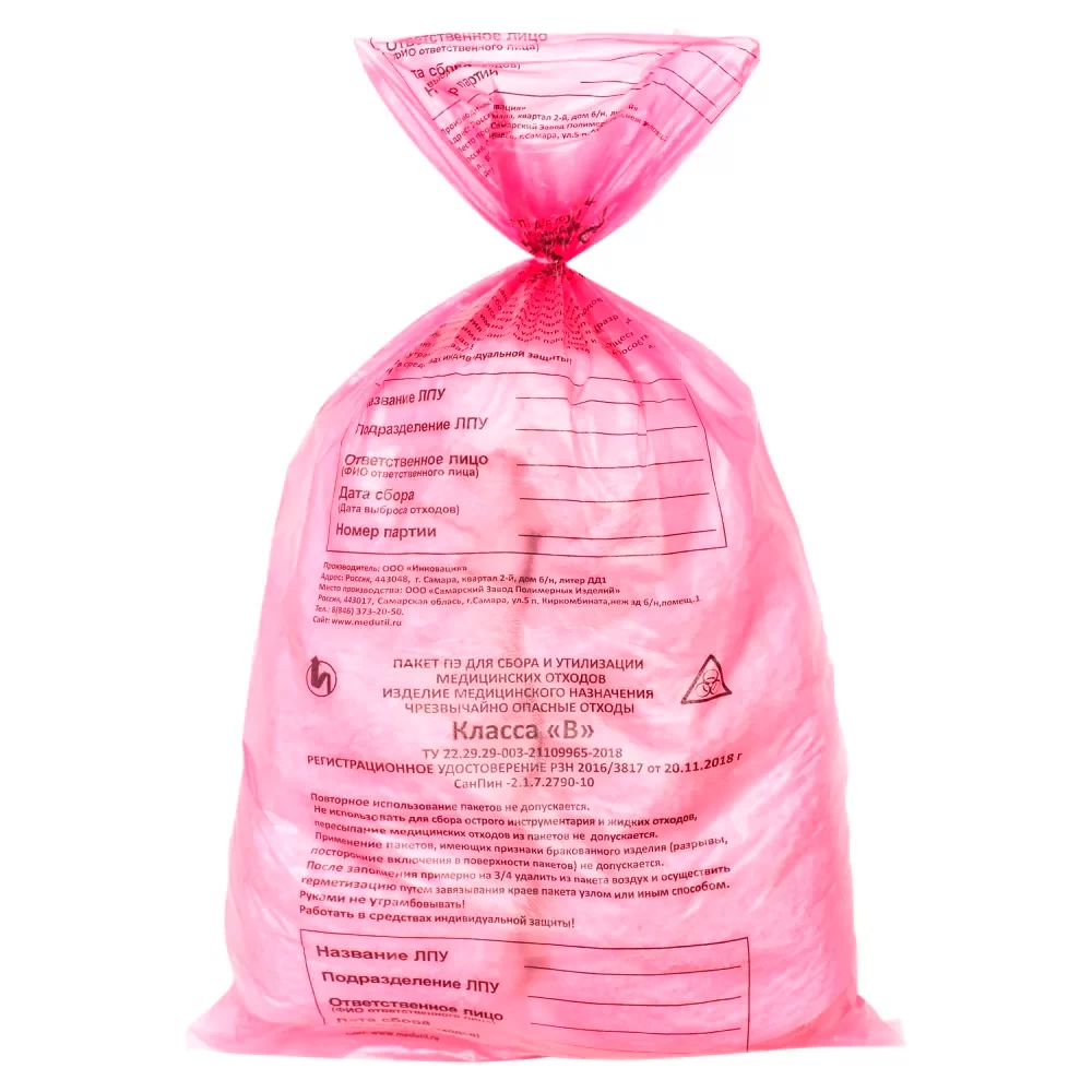 Не используйте пакет повторно и не пересыпайте медицинские отходы из пакета; в пакет нельзя складывать острый инструментарий и сливать жидкие отходы. Не используйте пакеты с разрывами, посторонними включениями в поверхность и другими признаками брака.