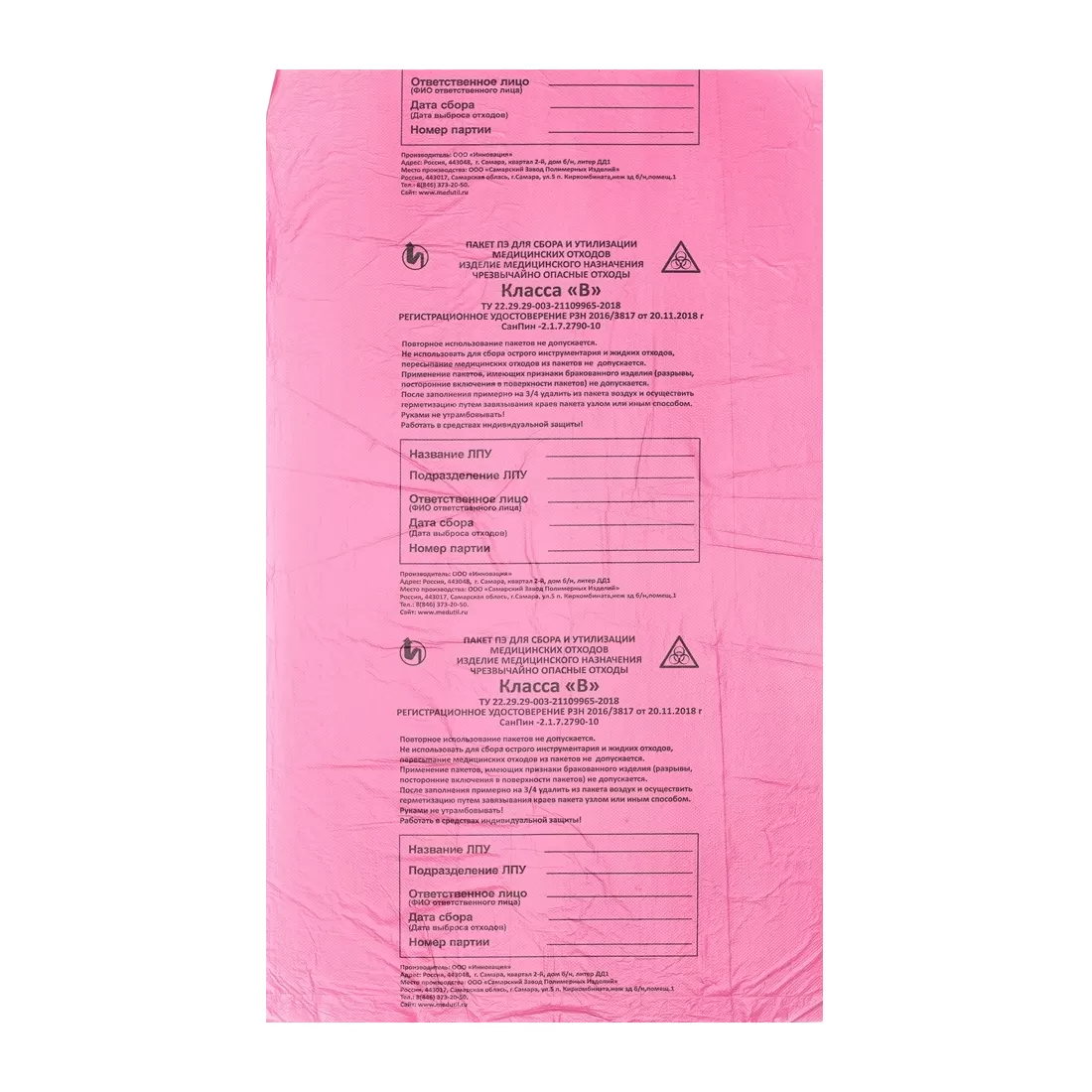 Не используйте пакет повторно и не пересыпайте медицинские отходы из пакета; в пакет нельзя складывать острый инструментарий и сливать жидкие отходы. Не используйте пакеты с разрывами, посторонними включениями в поверхность и другими признаками брака.
