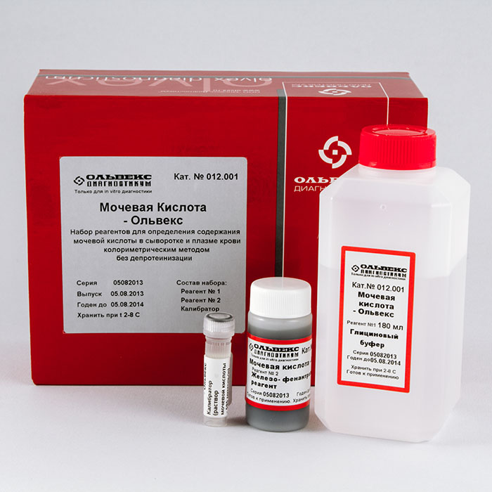 Набор реагентов «Мочевая кислота-1-Ольвекс» предназначен для количественного определения содержания мочевой кислоты в сыворотке (плазме) крови и моче колориметрическим методом. Набор рассчитан на 200 определений при конечном объёме реакционной смеси 1.025 мл.