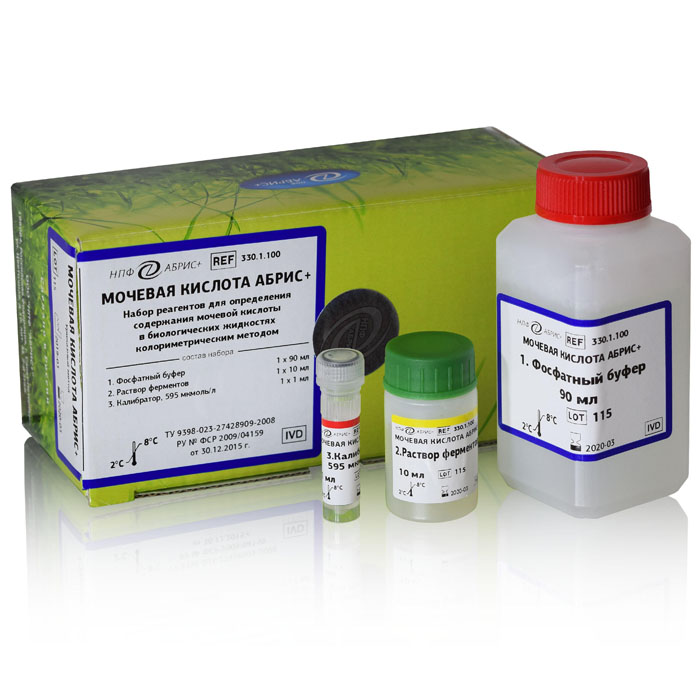 Набор реагентов для определения содержания мочевой кислоты в биологических жидкостях энзиматическим колориметрическим методом без депротеинизации.