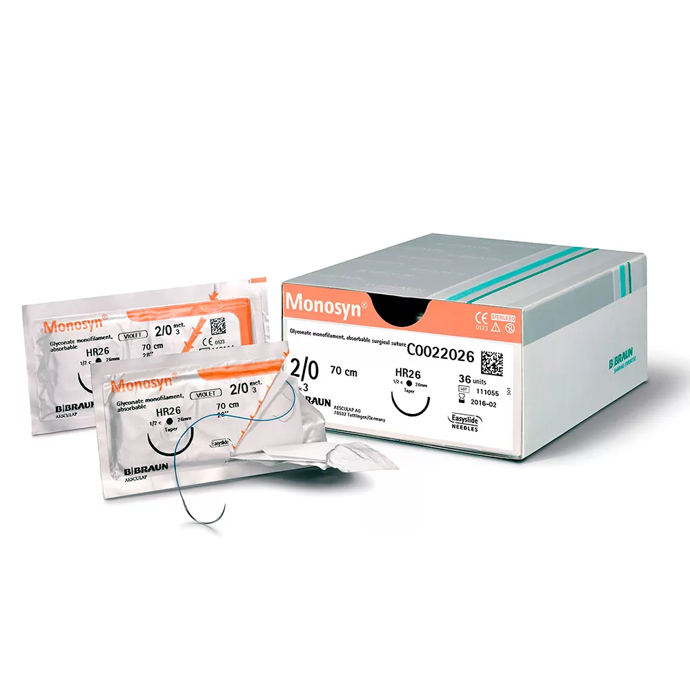 - Моносин (Monosyn) — синтетическая монофиламентная нить со средним сроком рассасывания на основе гликоната. Нить Monosyn доступна в неокрашенном виде для закрытия поверхностных ран и в фиолетовом цвете для лучшей визуализации при работе в глубине раны. Monosyn позволяет осуществлять надежную поддержку мягких тканей на протяжении всего периода заживления.