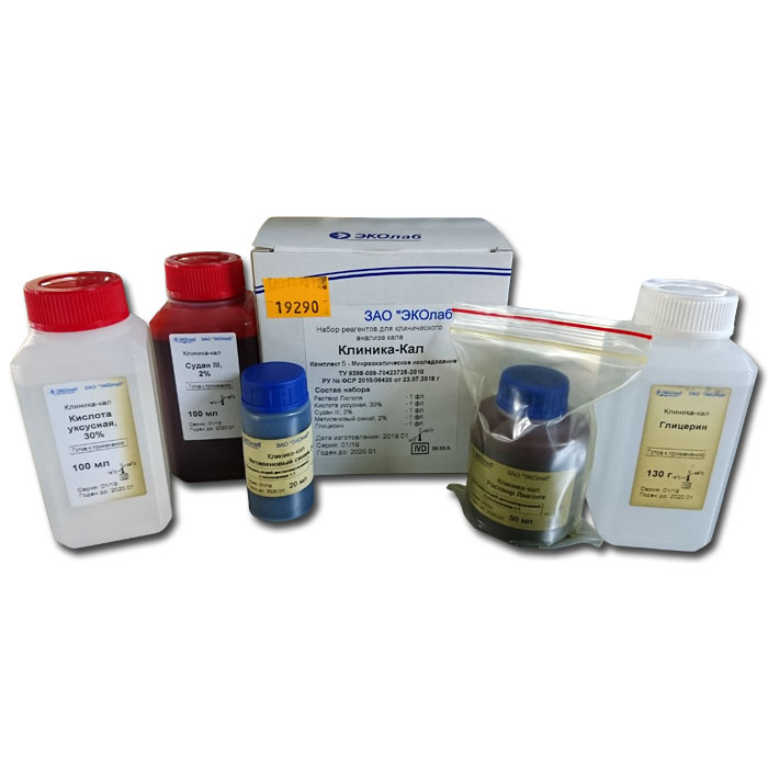 Набор реагентов ЭКОлаб-Клиника-Кал Комплект 5 предназначен для микроскопического исследования кала в клинико-диагностических лабораториях. Рассчитан на приготовление 2000 препаратов.