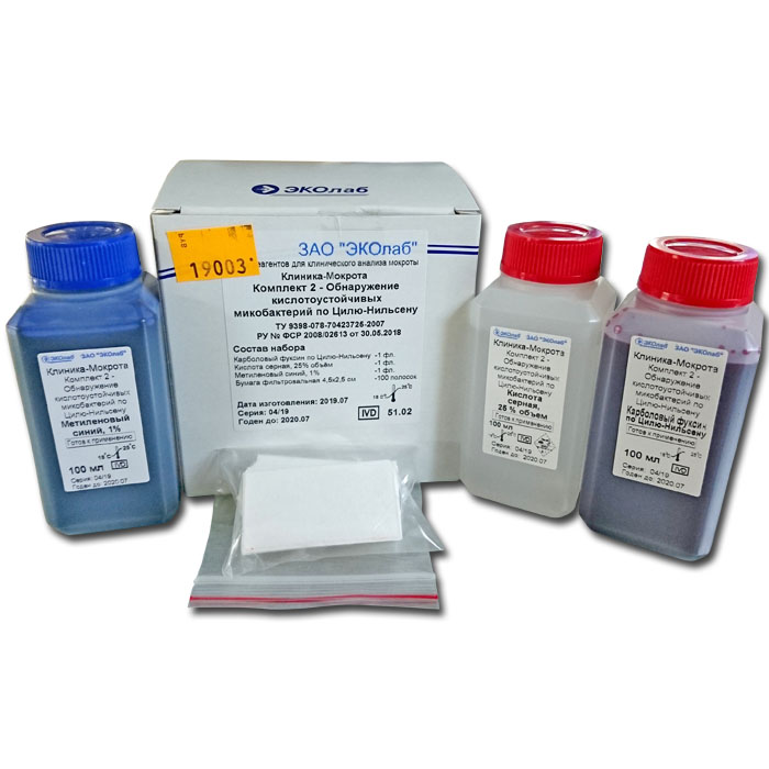 Набор реагентов предназначен для обнаружения кислотоустойчивых микобактерий по методу Циля-Нильсена. Рассчитан на анализ 100 препаратов.