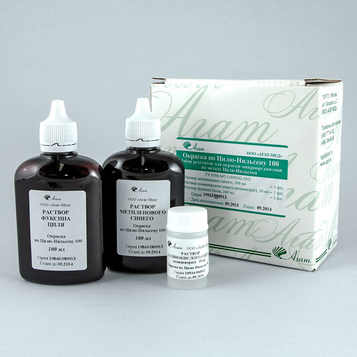 Набор реагентов предназначен для диагностической окраски микроорганизмов в мазках (гной, мокрота, моча и др.) и выявления в них кислотоустойчивых бактерий (Mycobacterium tuberculosis и Mycobacterium leprae).