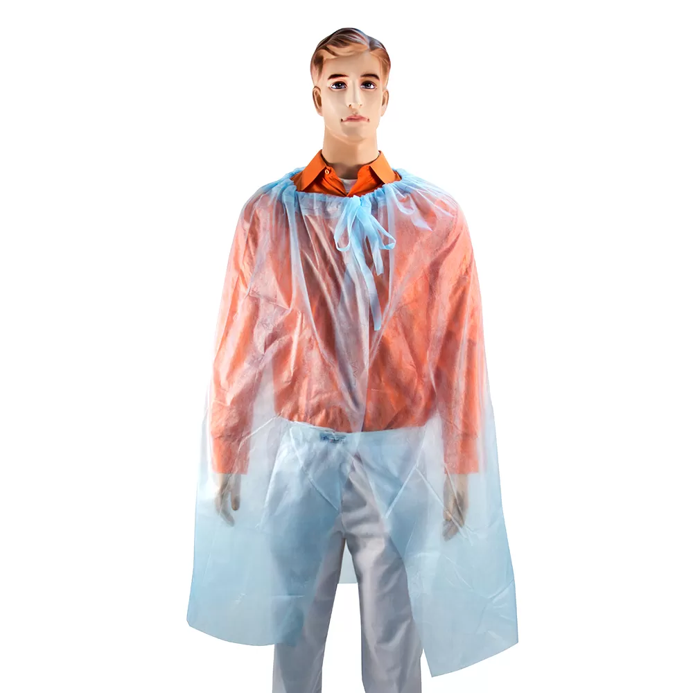 - Накидка для пациента голубого цвета без рукавов изготовлена из воздухопроницаемого первичного нетканого полипропилена.