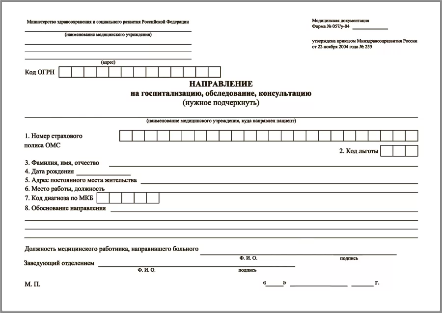 Направление на госпитализацию, восстановительное лечение, обследование, консультацию 057/у-04.