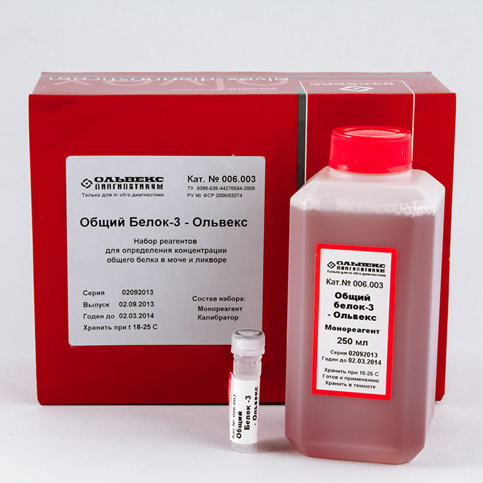 Набор реагентов «Общий белок-3-Ольвекс» предназначен для количественного определения содержания общего белка в моче и ликворе человека колориметрическим методом с пирогаллоловым красным.