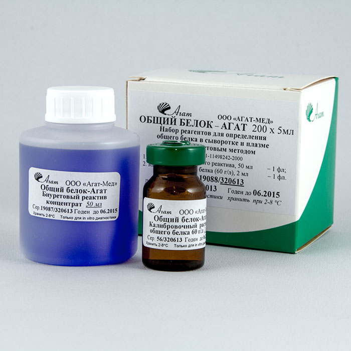 Диагностический набор ОБЩИЙ БЕЛОК АГАТ предназначен для количественного определения содержания общего белка в сыворотке или плазме крови в клинико-диагностических и биохимических лабораториях.