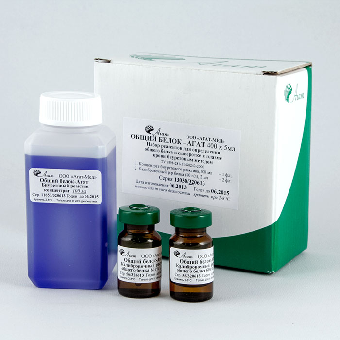 Диагностический набор ОБЩИЙ БЕЛОК АГАТ предназначен для количественного определения содержания общего белка в сыворотке или плазме крови в клинико-диагностических и биохимических лабораториях.