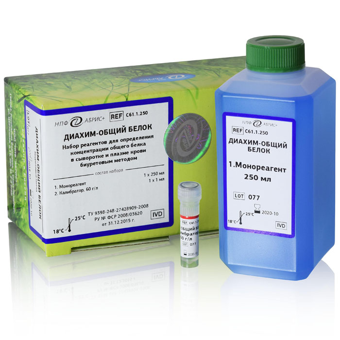 Набор реагентов для определения концентрации общего белка в сыворотке и плазме крови биуретовым методом.