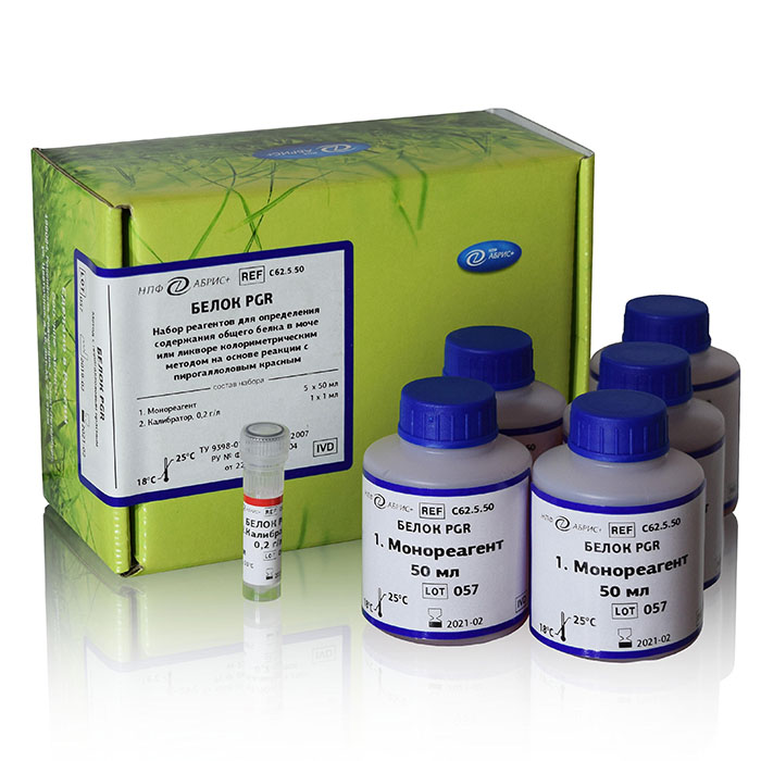Набор реагентов для определения содержания общего белка в моче или ликворе колориметрическим методом с пирогаллоловым красным.