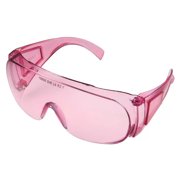 Специализированные очки с увеличенным панорамным защитным стеклом-светофильтром из прозрачного незапотевающего поликарбоната с твердым покрытием от истирания и царапания, увеличенная защита спереди и с боков, сверху и снизу от лазерного излучения, высокоскоростных летящих частиц с низкоэнергетическим ударом.
