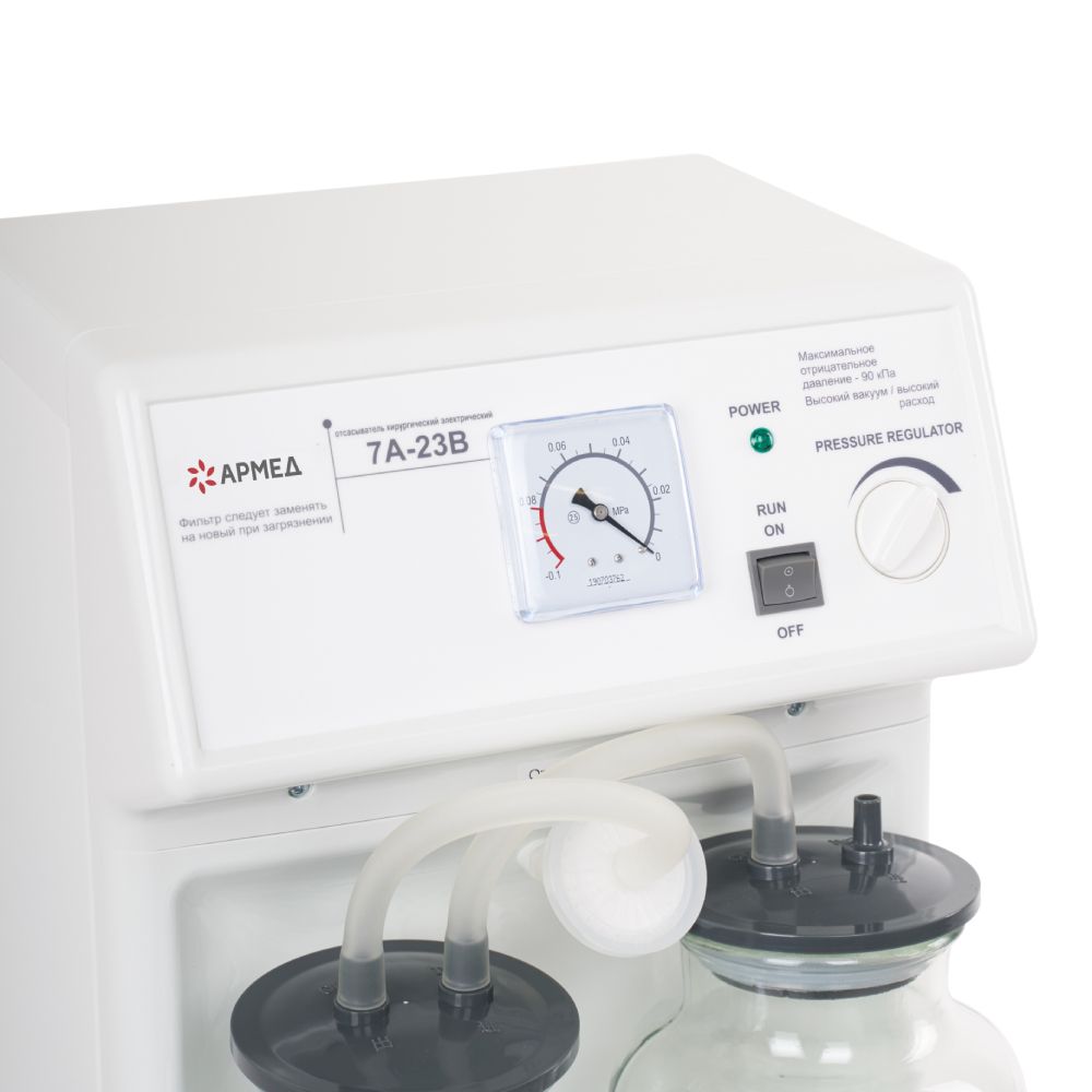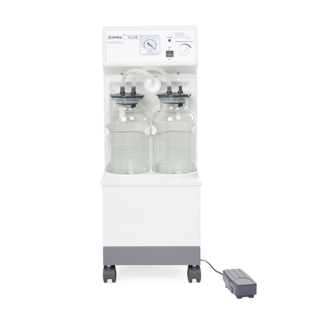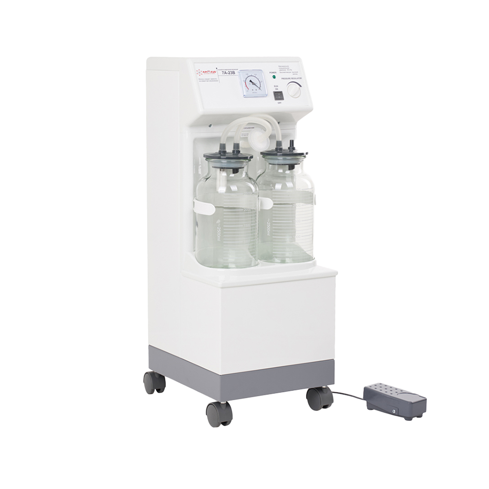 Передвижной хирургический отсасыватель в металлическом ударопрочном корпусе. Аппарат рассчитан на непрерывную работу в течение 4 часов. Применяется при проведении длительных операций высокой сложности. Для оперативного дистанционного управления устройством имеется удобная педаль запуска. Устройство комплектуется специальным металлическим наконечником, который необходим для полостных операций.