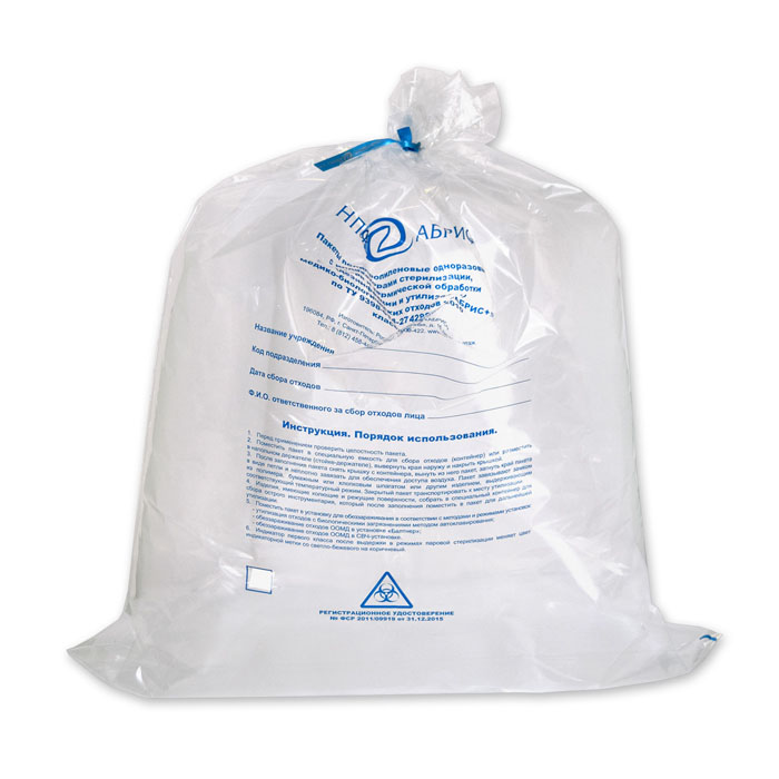 Пакеты полипропиленовые одноразовые с индикаторами стерилизации, для сбора и термической обработки (дезинфекции и утилизации) медико-биологических отходов. Предназначены для обеззараживания отходов ЛПУ методами автоклавирования и обработки в СВЧ-поле.
