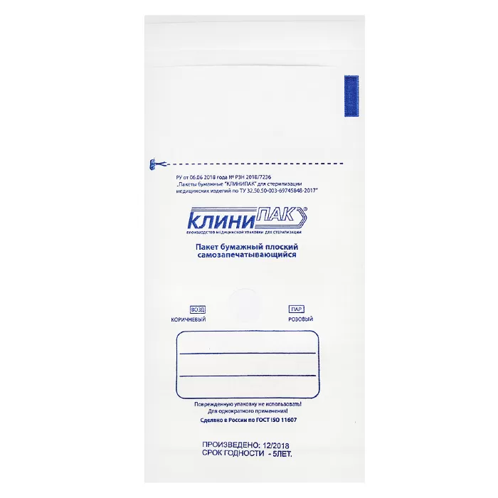 Пакеты самозаклеивающиеся плоские представляют собой упаковку различной ширины и длины, состоящую из влагостойкой бумаги (белого цвета) плотностью 70 г/м2, и предназначены для упаковывания небольших по толщине изделий. Герметизация пакетов осуществляется вручную. Метод стерилизации – паровой, воздушный. Индикатора стерилизации 1 класса, размер и название упаковки, а также дополнительная информация расположены на лицевой стороне вне зоны загрузки инструментов. Максимальный срок сохранения стерильности изделий, простерилизованных в самозаклеивающихся пакетах "Клинипак", составляет 3 года при соблюдении условий хранения.