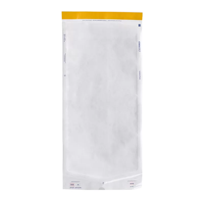 Комбинированные пакеты из многослойной прочной пленки в сочетании с нетканым материалом Tyvek для стерилизации упакованных инструментов и ИМН плазменным методом (с применением паров перекиси водорода в сочетании с ее низкотемпературной плазмой) в стерилизаторах «Стеррад», «HMTS», «Лаокен», «Stericool» и др. На выступающий клапан пакета нанесен слой клея, защищенный бумажной полоской желтого цвета, предотвращающей высыхание клея.