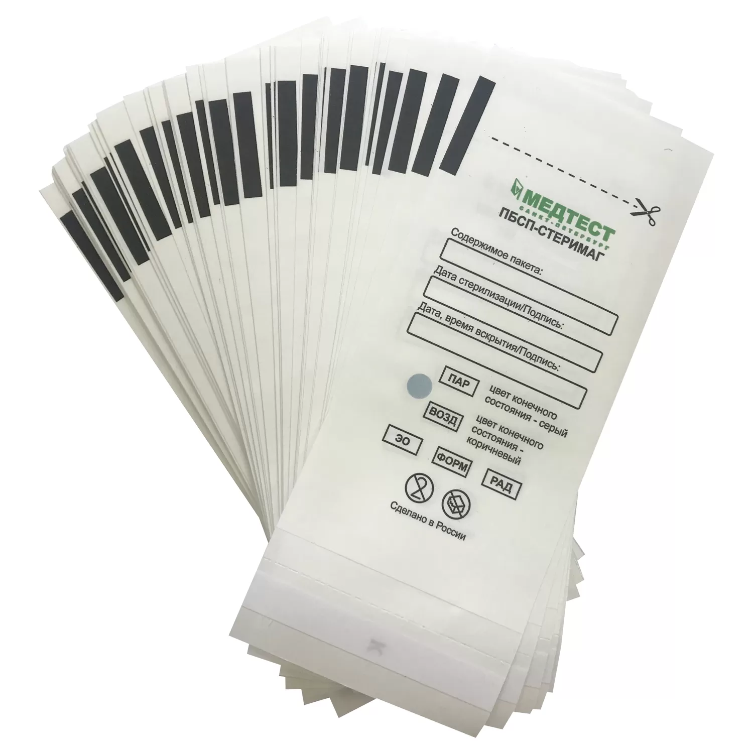 Медицинское изделие Пакет бумажный самоклеящийся плоский ПБСП-СТЕРИМАГ. Пакет представляет собой прямоугольный конверт, изготовленный из отбеленной бумаги, имеющий не менее трех клеевых швов (со склеенными боковыми и донным швами) с соответствующей маркировкой и химическими индикаторами-свидетелями первого класса по ГОСТ ISO 11140-1-2011. С открытой стороны пакета на внутренней поверхности выступающей бумажной части нанесен слой термостойкого клея, закрытый защитной лентой.