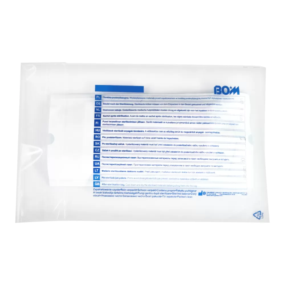 Послестерилизационные пакеты под маркой BOM являются эффективной защитой стерильных пакетов от пыли, влаги и загрязнения. Самоклеящееся закрытие.