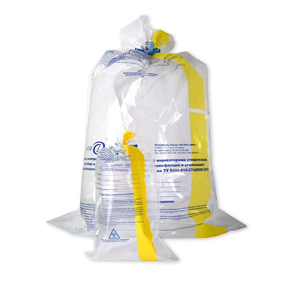 Пакеты полипропиленовые одноразовые с индикаторами стерилизации, для сбора и термической обработки (дезинфекции и утилизации) медико-биологических отходов.