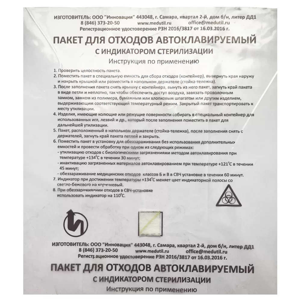 Прозрачный пакет с индикатором для автоклавирования отходов.