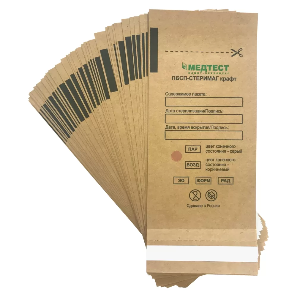 - Пакеты ПБСП-СТЕРИМАГ крафт изготовлены из крафт-бумаги. Все виды бумаг, используемые для производства пакетов, изготовлены из особо чистой целлюлозы, обладающей барьерными свойствами, обработанной с целью придания влагопрочности.