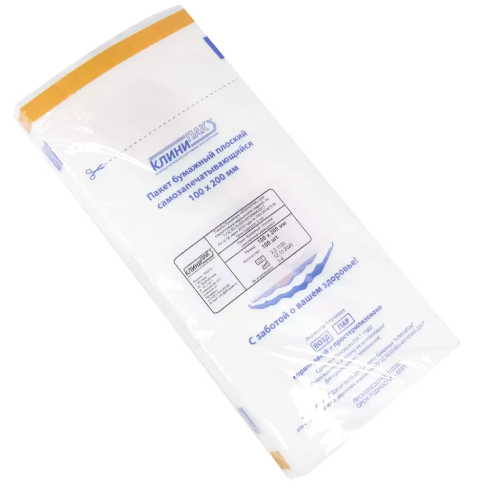 - Пакеты бумажные КЛИНИПАК изготовлены из влагостойкой медицинской бумаги белого цвета плотностью 70 г/м2 и имеют термоклеевые боковые швы.