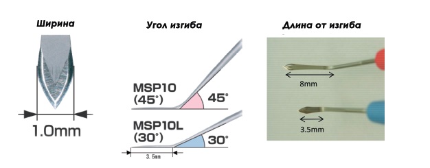 Изогнутое лезвие: Доступны две конфигурации изгиба: 30° (модель MSP10L) и 45° (модель MSP10). Это позволяет хирургу оптимально подобрать угол атаки для безопасной работы при глубокой посадке глаза, узкой глазной щели или мелкой передней камере.