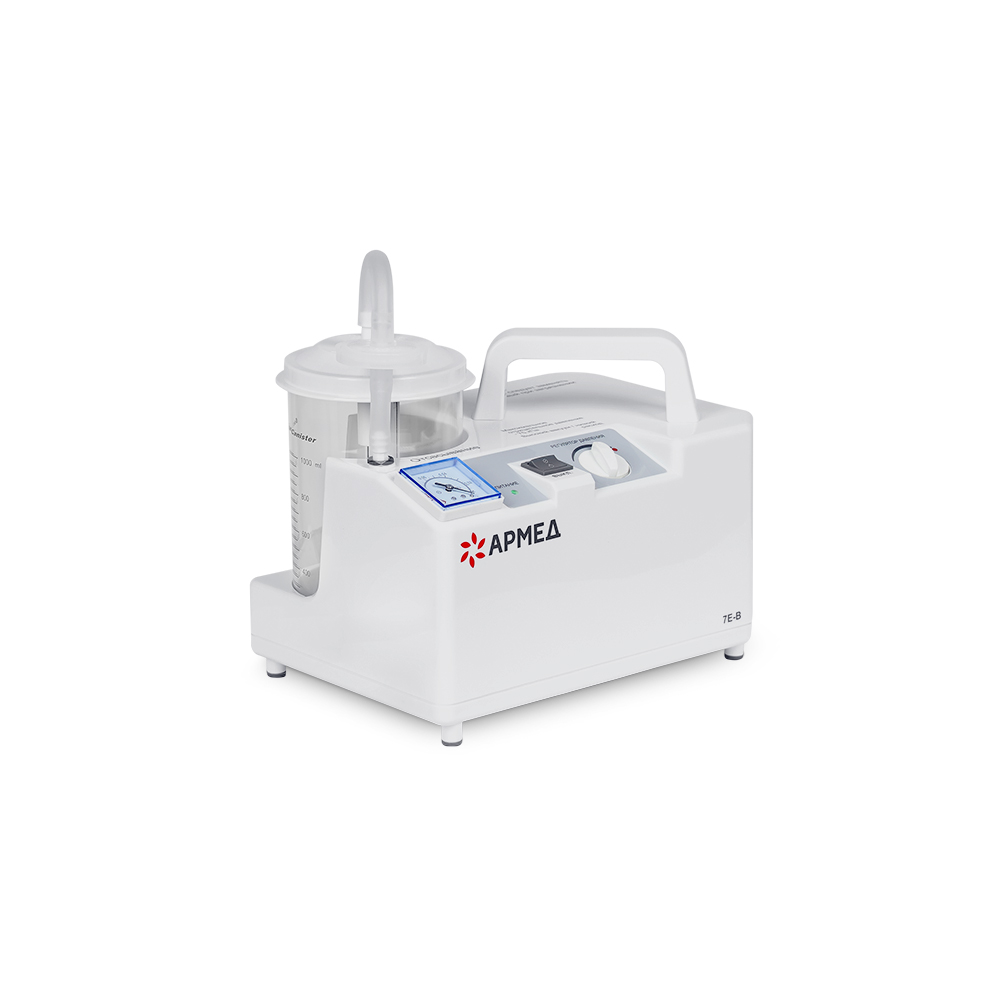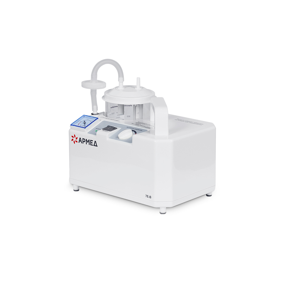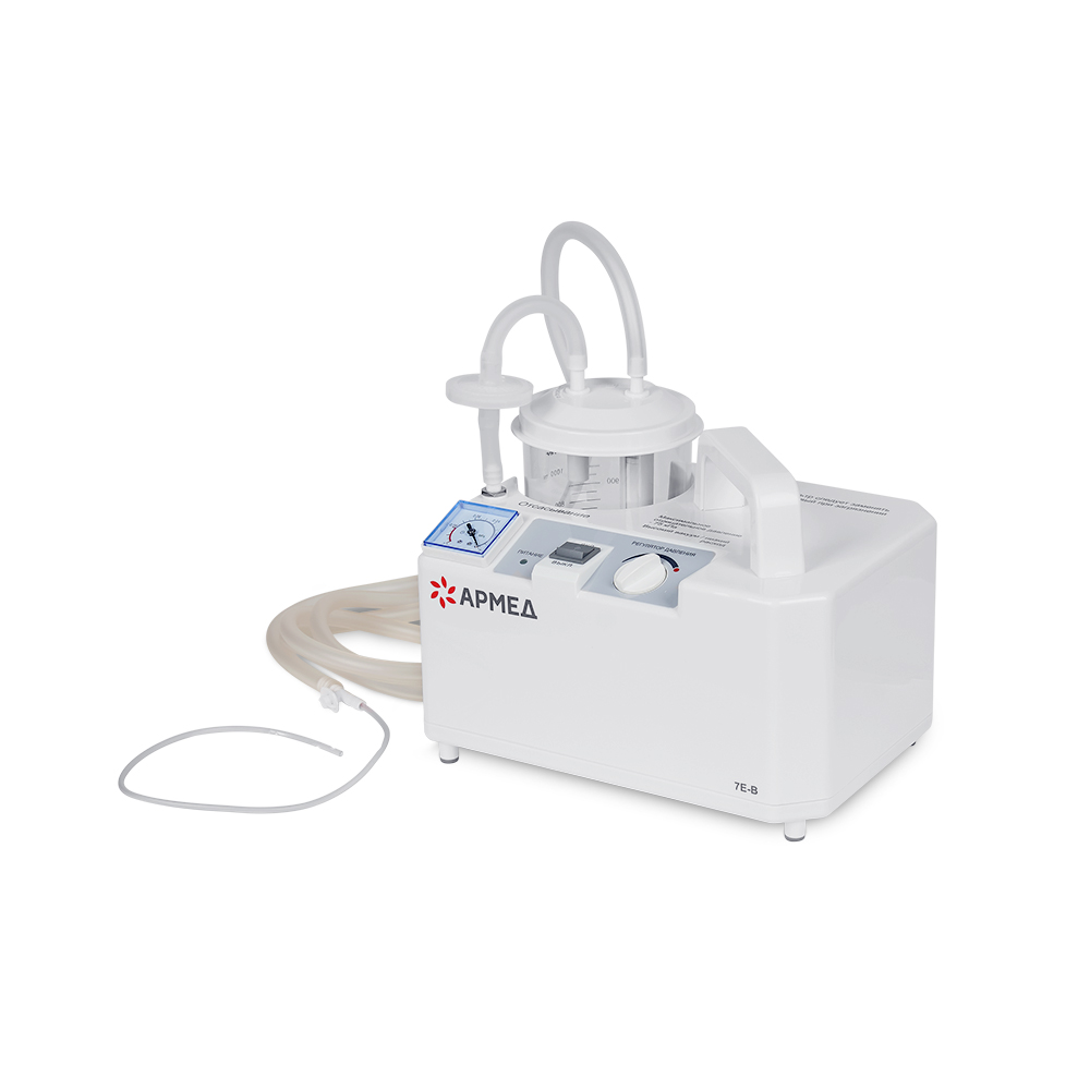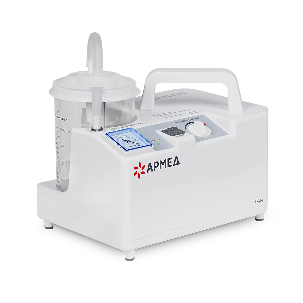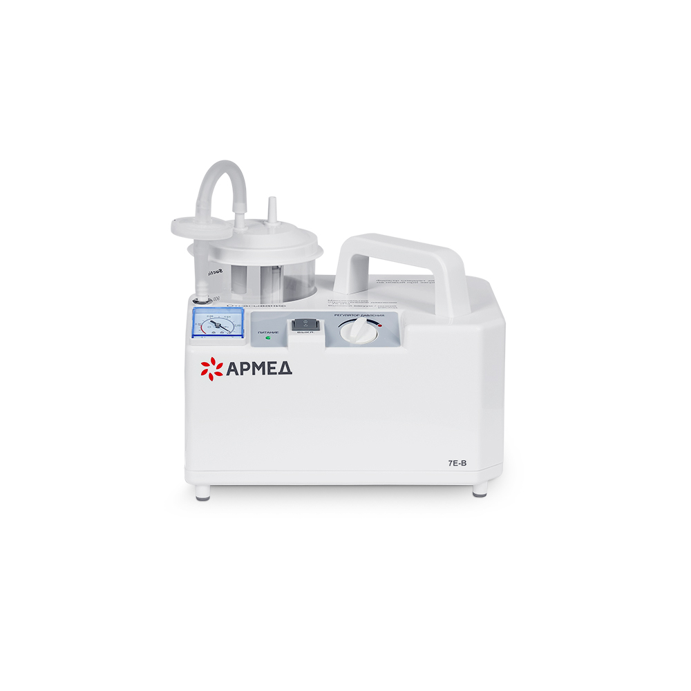 Педиатрический отсасыватель Армед 7Е-В имеет небольшие габариты, поэтому его можно переносить в помещении за удобную ручку. Для включения и управления прибором предназначена одна кнопка и механический регулятор. В комплекте с оборудованием предусмотрен специальный детский катетер.