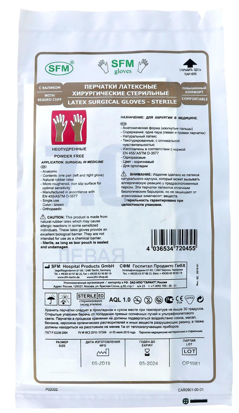 Перчатки хирургические одноразовые стерильные латексные SFM: - Латексные, неопудренные, анатомические, текстурированные, манжета с валиком, без адгезивной полосы, однократная хлоринация, цвет коричневый.